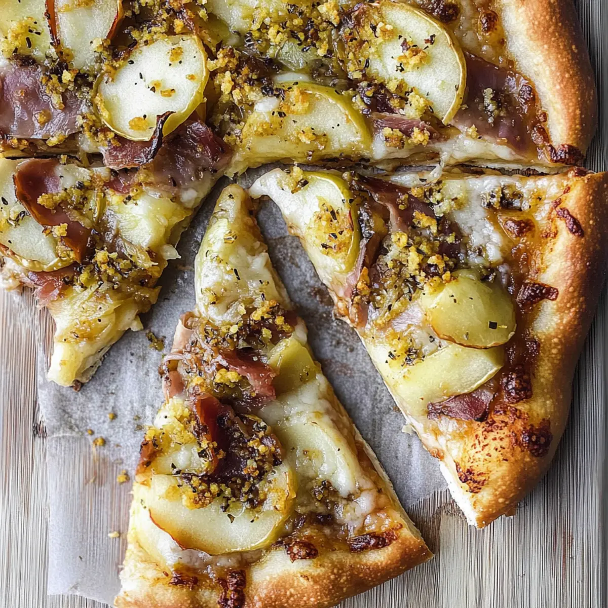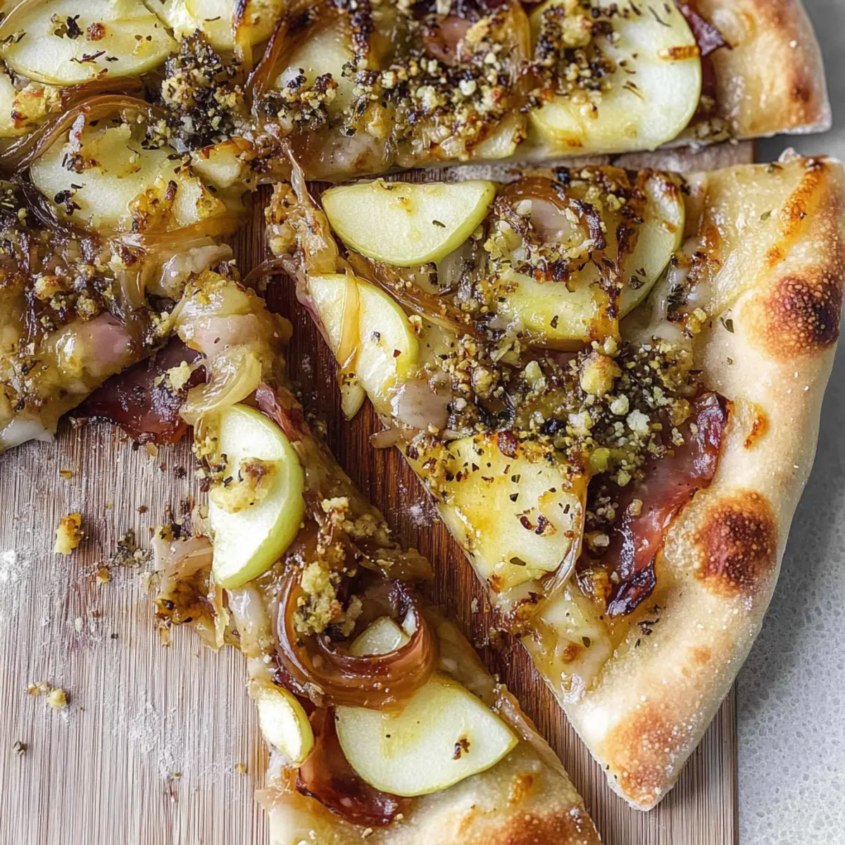 - Preheat a pizza stone in your oven at 500°F for at least 30 minutes. On a floured surface, roll out your prepared pizza dough into a 12-inch circle. Spread an even layer of the caramelized onions over the dough, followed by thinly sliced Honeycrisp apples. Top generously with grated Gruyère cheese, then finish with the toasted prosciutto crumble.