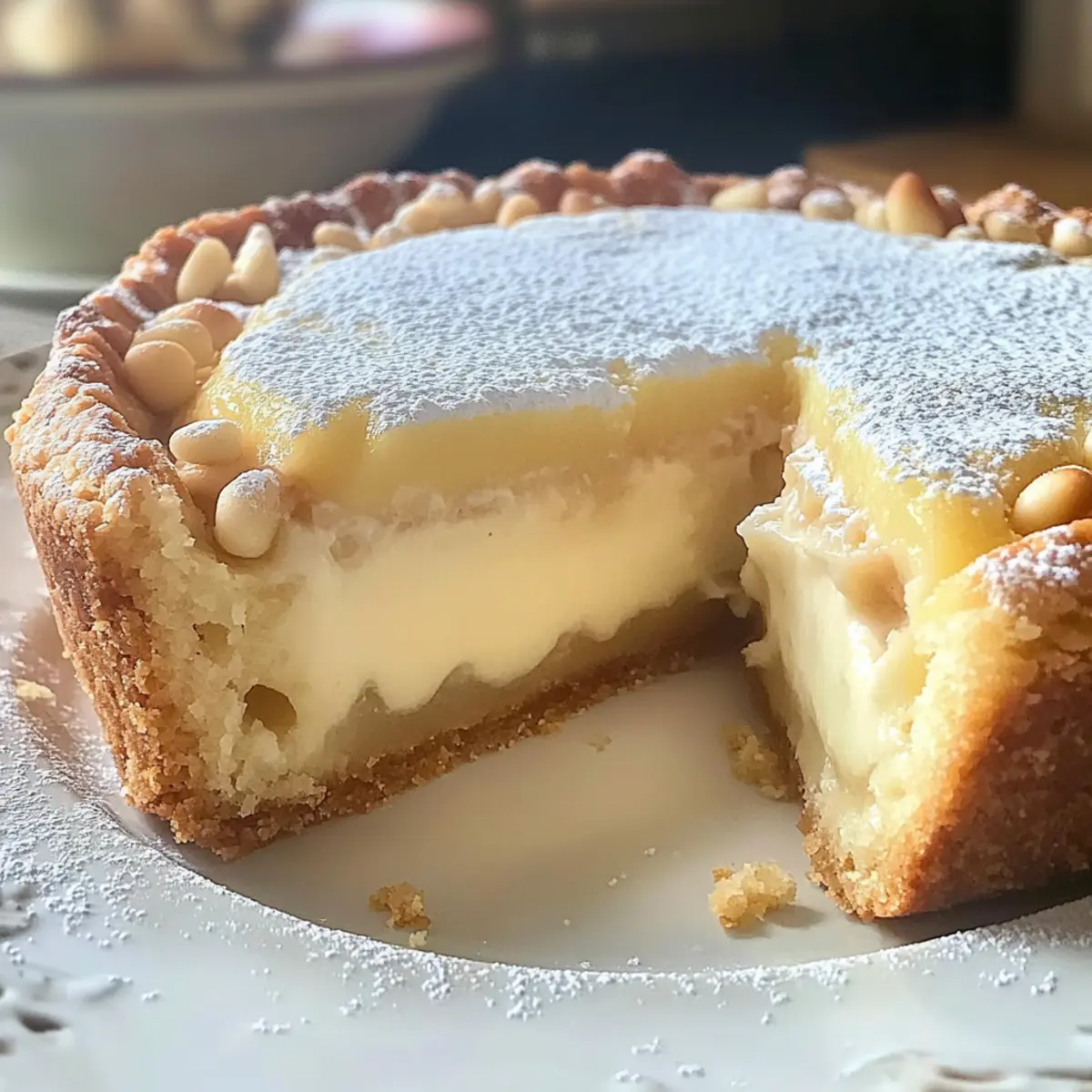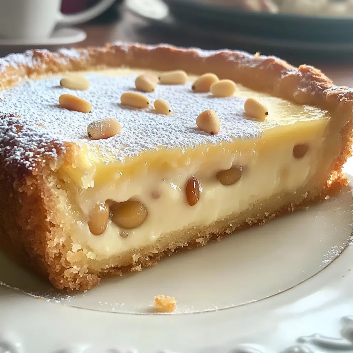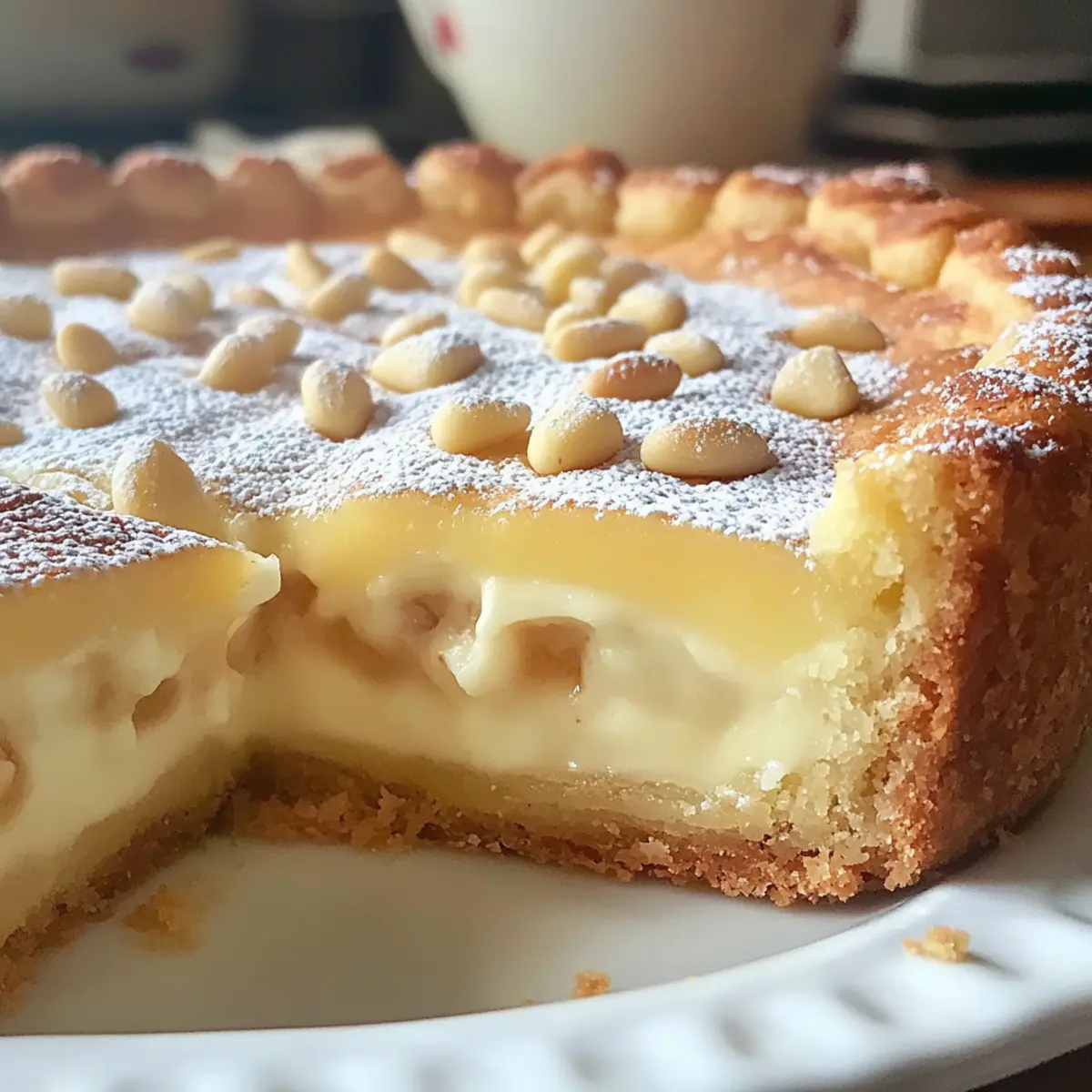 Sprinkle the pine nuts or sliced almonds generously over the custard. These will add a delightful crunch and complement the creamy filling beautifully, enhancing the overall experience of your Authentic Italian Torta della Nonna.