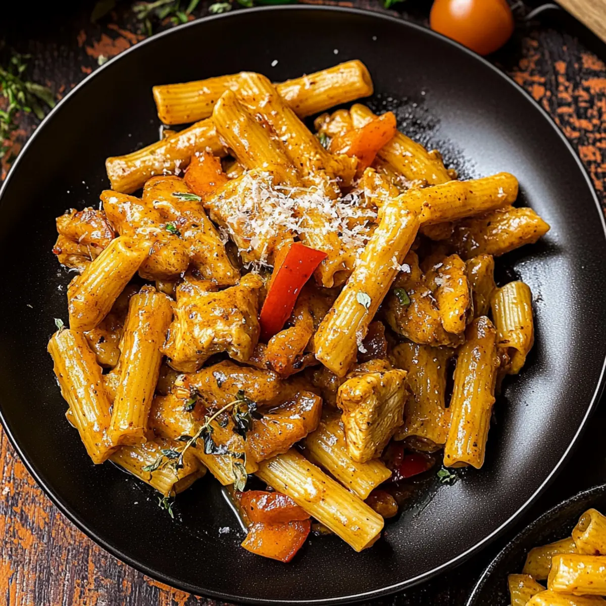 Once the sauce has reached the desired consistency, return the seared chicken and fresh thyme sprigs to the skillet. Toss in the cooked pasta, stirring until every piece is coated in the luscious sauce. Remove the skillet from heat, discard the thyme stems, and your Authentic Jerk Chicken Rasta Pasta is ready to be served!