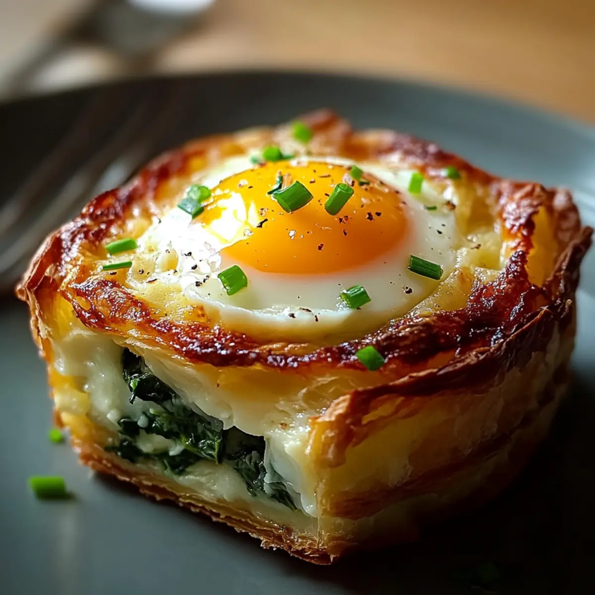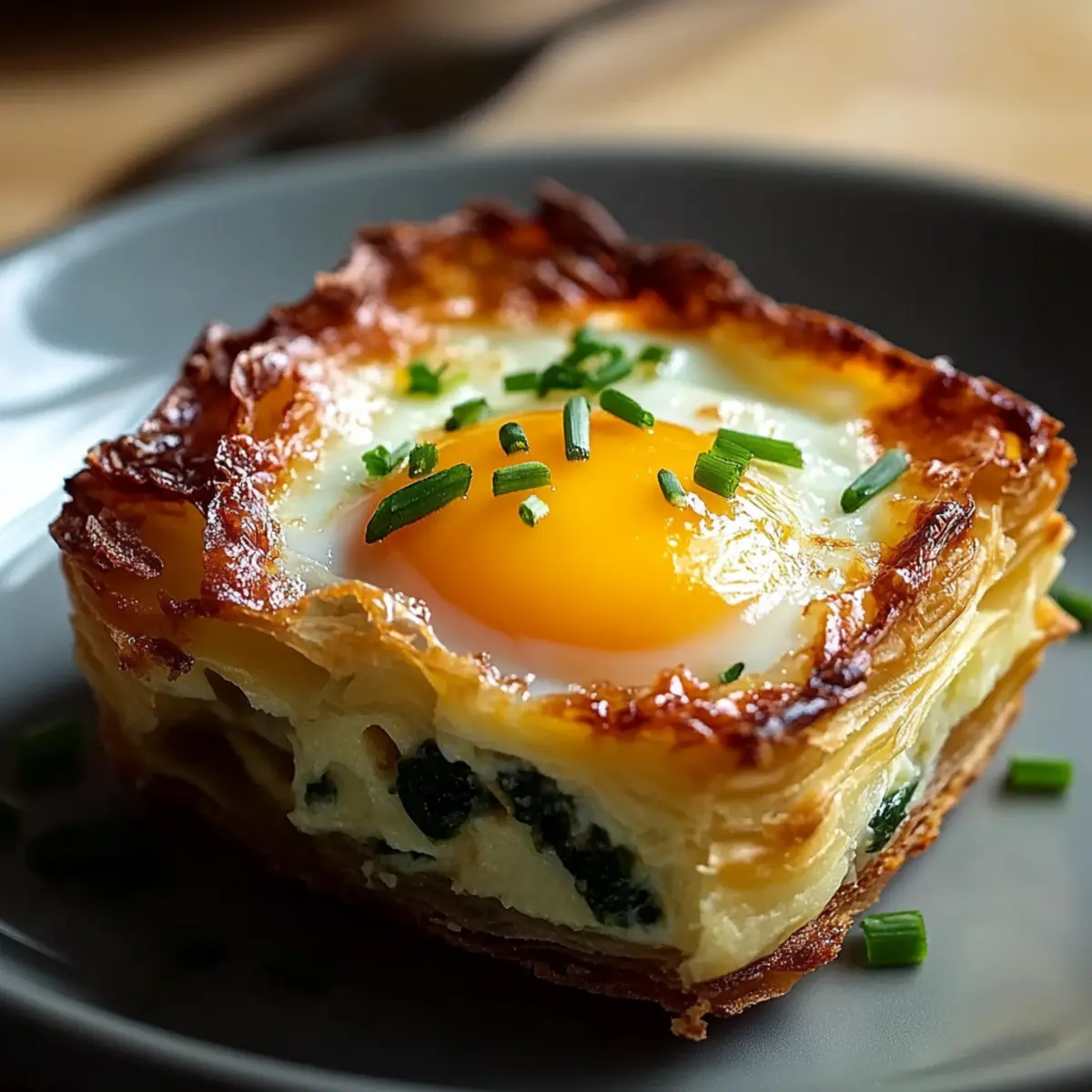 Once baked to perfection, remove the Baked Eggs Napoleon from the oven and let them cool slightly. Garnish with freshly chopped chives for a burst of color and flavor. Serve hot, and delight in the flaky pastry, creamy filling, and runny yolk that make this dish a brunch favorite!