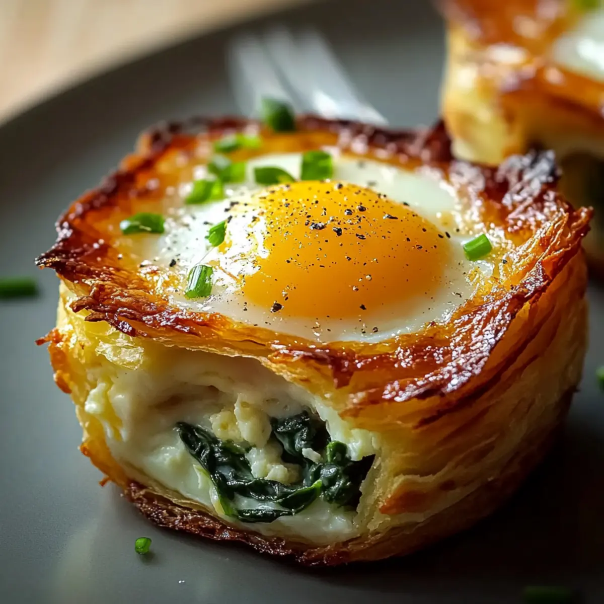 Take the baked pastry shells out of the oven and carefully spoon the spinach filling evenly into each cup. Then, with utmost care, crack a large egg on top of the filling in each ramekin. The eggs will bake beautifully nestled in the creamy mixture, adding richness to your Baked Eggs Napoleon.