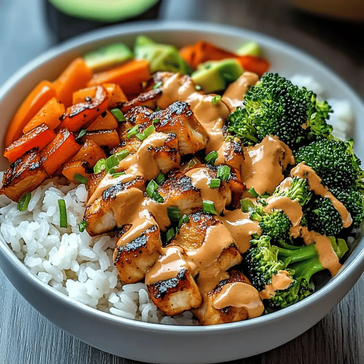 With your bowl beautifully assembled, it’s time to add the finishing touch! Generously drizzle the creamy Bang Bang sauce over the chicken and vegetables, ensuring every element is coated with that delightful flavor. The vibrant colors and enticing aroma will make it hard to resist diving in right away.