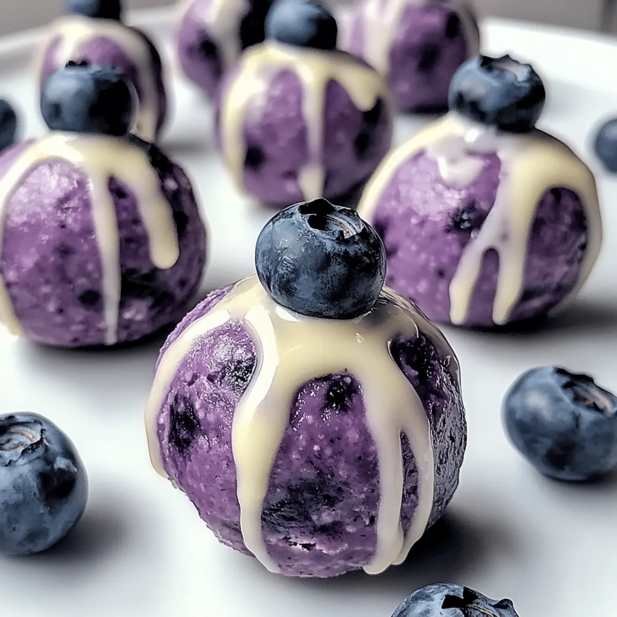 Once chilled, drizzle the cream cheese glaze over the bites and garnish with a few fresh blueberries for an extra pop of color. If desired, return them to the refrigerator for a few more minutes to let the glaze set. Serve your Blueberry Cheesecake Protein Bites best chilled for a refreshing, healthy treat.