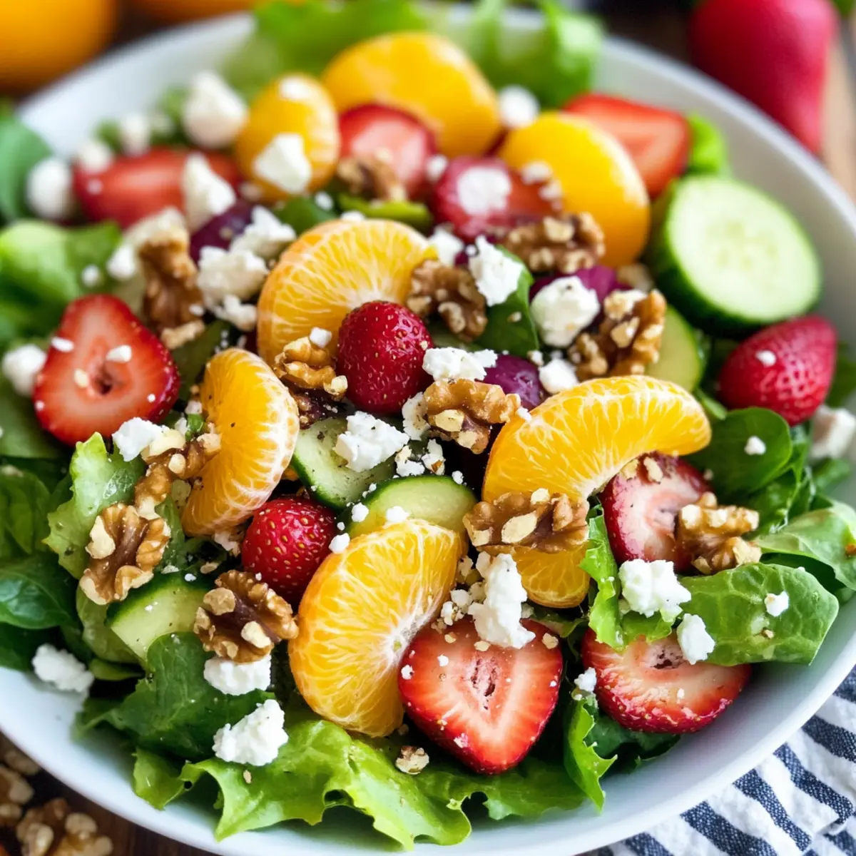 - In a large serving bowl, combine the salad greens, strawberries, orange segments, cucumbers, and red onions.