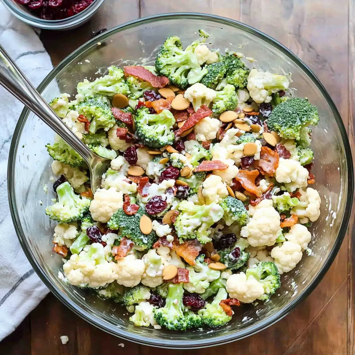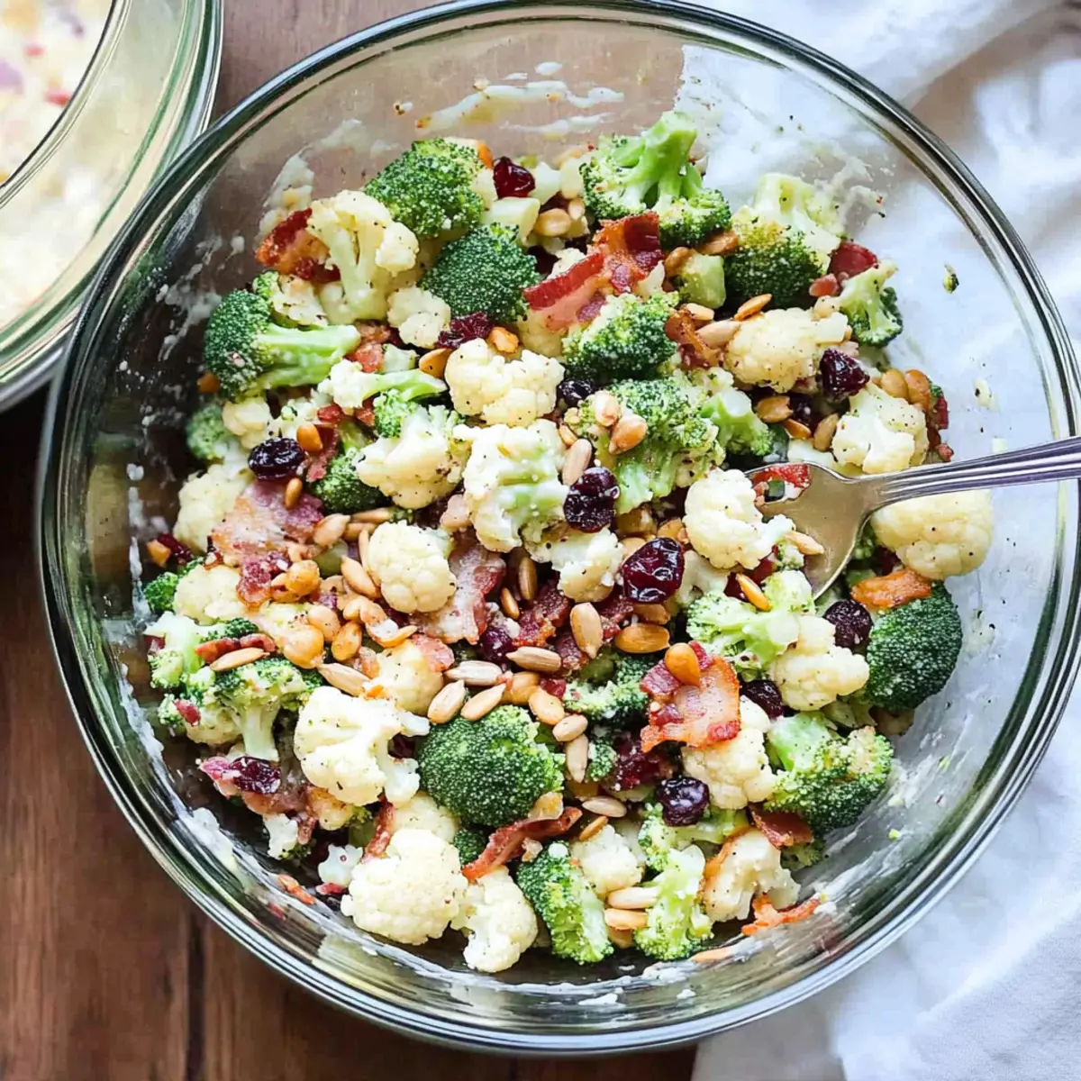 In a large salad bowl, combine the broccoli florets, cauliflower florets, diced red onion, 1 cup of mild cheddar cheese (cubed or shredded), 1/2 cup of sunflower seeds, and 1 cup of dried cranberries. Crumble the cooled bacon and add it to the mixture for that smoky crunch. Stir gently to ensure an even distribution of flavors in your Broccoli Cauliflower Salad.