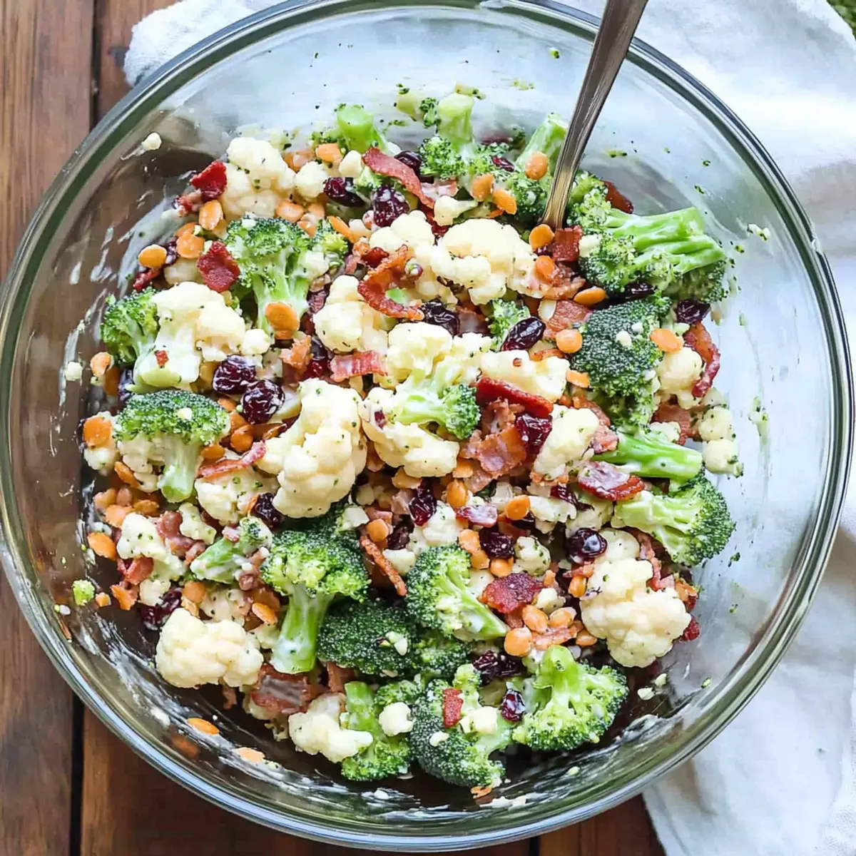 Vibrant Flavors: This delightful salad combines fresh, crisp broccoli and cauliflower with savory bacon, creating a sensational taste that’s sure to impress.