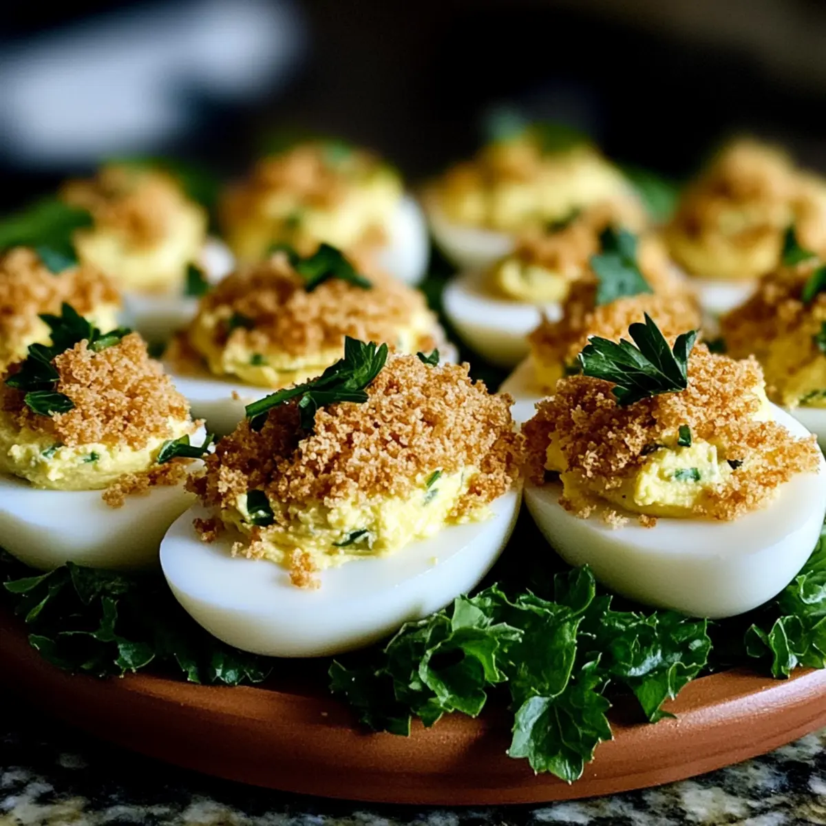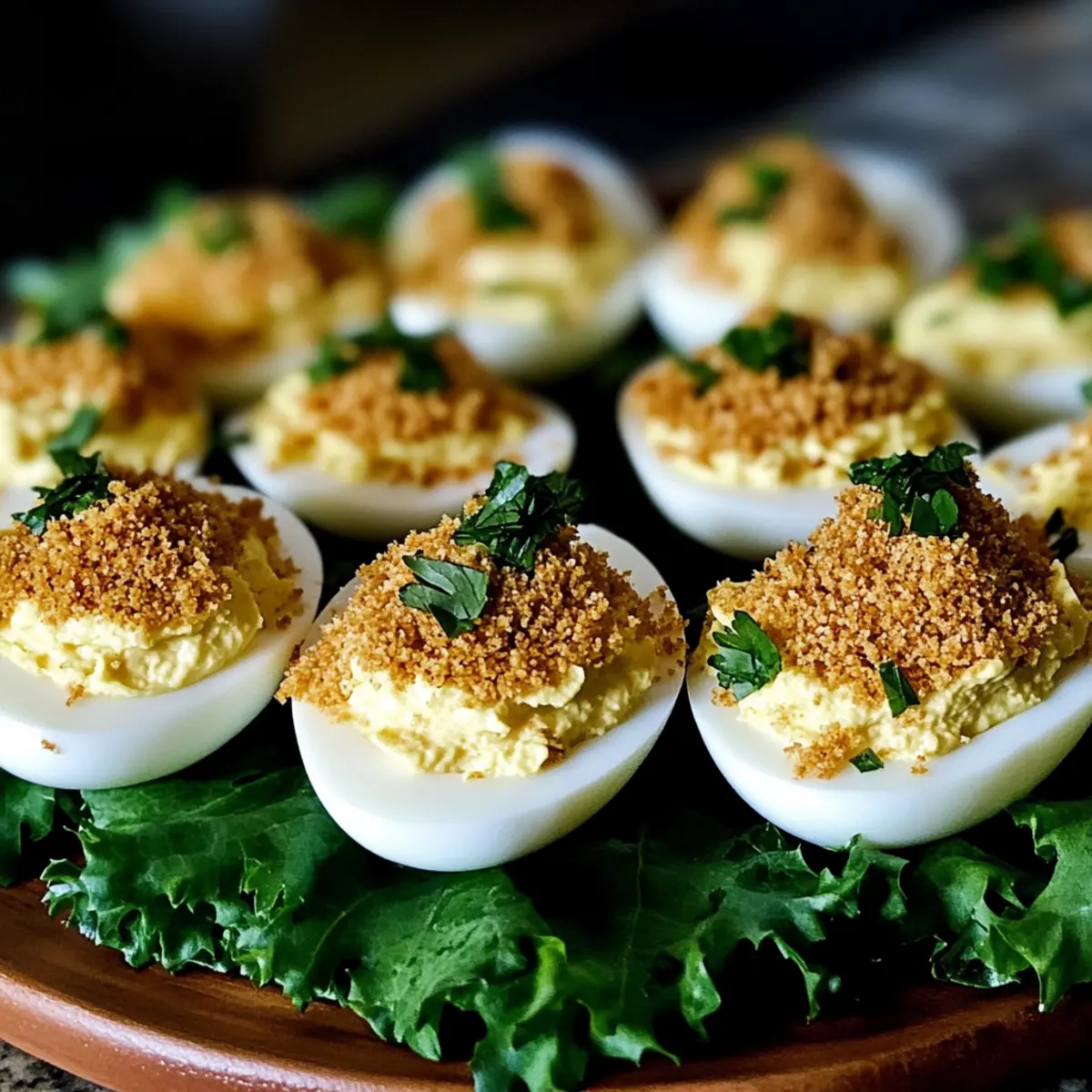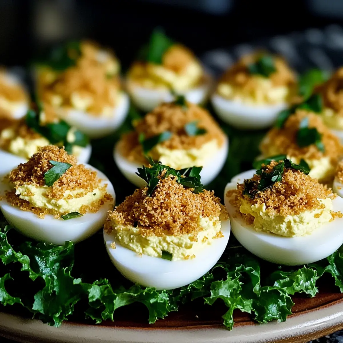 - Spoon or pipe the yolk mixture into egg whites. Top with the toasted panko mixture and serve on romaine lettuce.