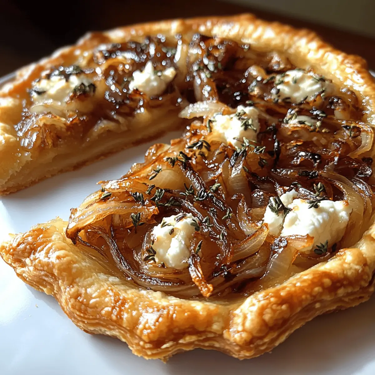 Crumble 4 ounces of goat cheese over the caramelized onions on each tart, adding extra sprigs of thyme if desired. The creamy, tangy cheese will contrast beautifully with the sweetness of the onions, enhancing the flavor profile of the tarts. Make sure the cheese is evenly distributed for balanced flavor in every bite.