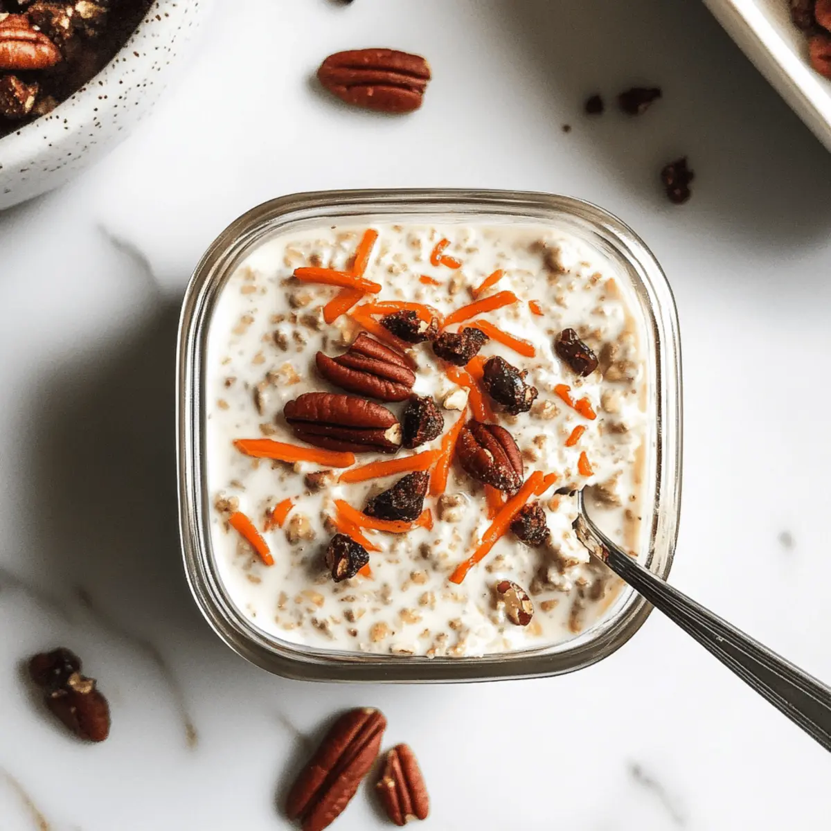 When ready to serve your Carrot Cake Overnight Oats, remove them from the fridge. Top with extra shredded carrots and chopped pecans for added crunch and garnish. These oats can be enjoyed cold straight from the jar for a quick breakfast, or feel free to grab one on the go. Each bite is a perfect combination of sweetness and creaminess, reminiscent of a decadent dessert!