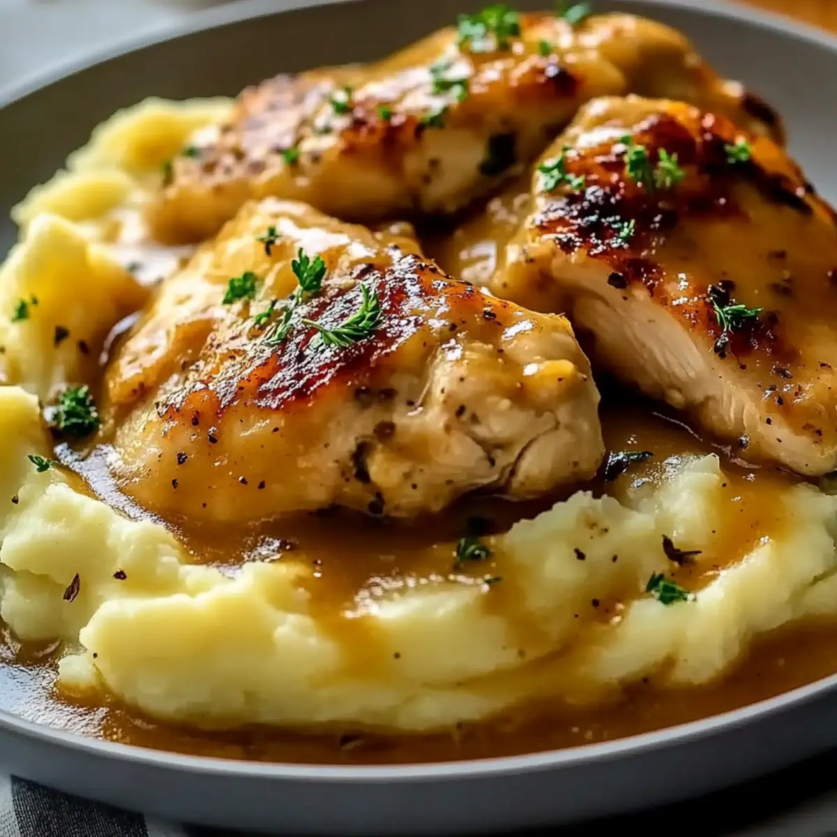 Comforting Chicken and Garlic Gravy with Cheesy Mashed Potatoes