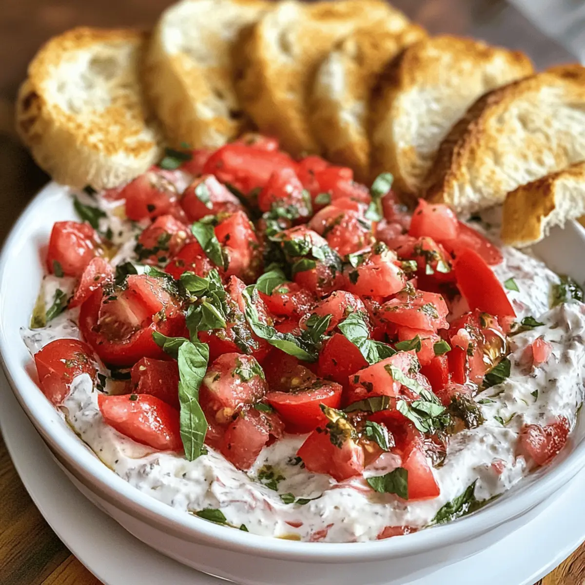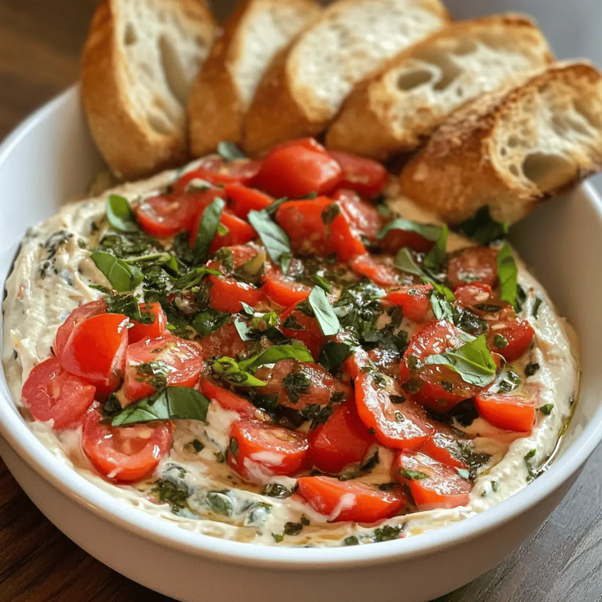 This Creamy Bruschetta Dip is a vegetarian appetizer that combines rich creaminess with fresh tomatoes and basil, perfect for any gathering.