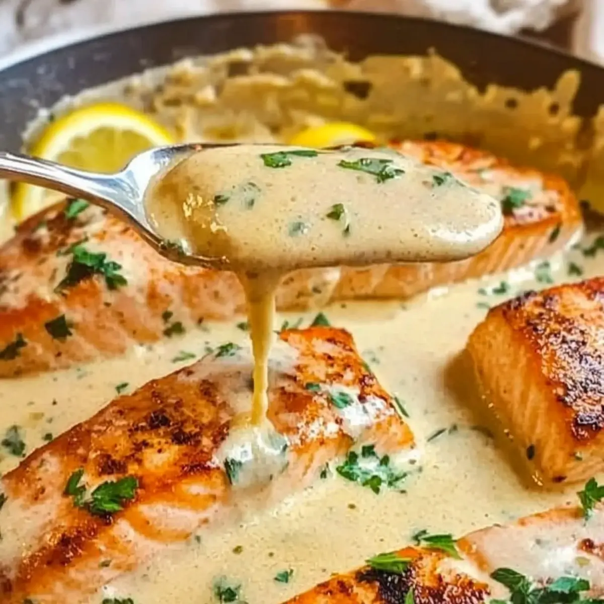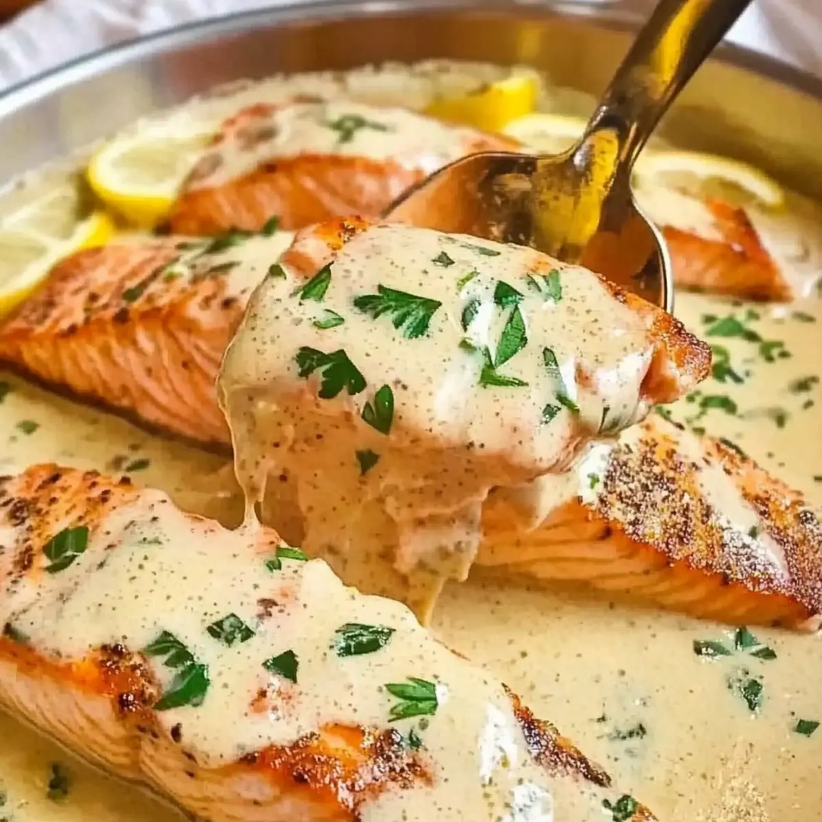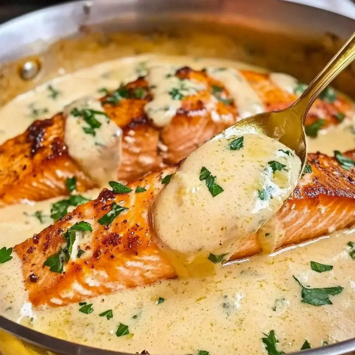 Experiment with Garnish: Take your dish to the next level by adding fresh herbs like dill or chives alongside parsley for more flavor diversity in your creamy garlic butter salmon.