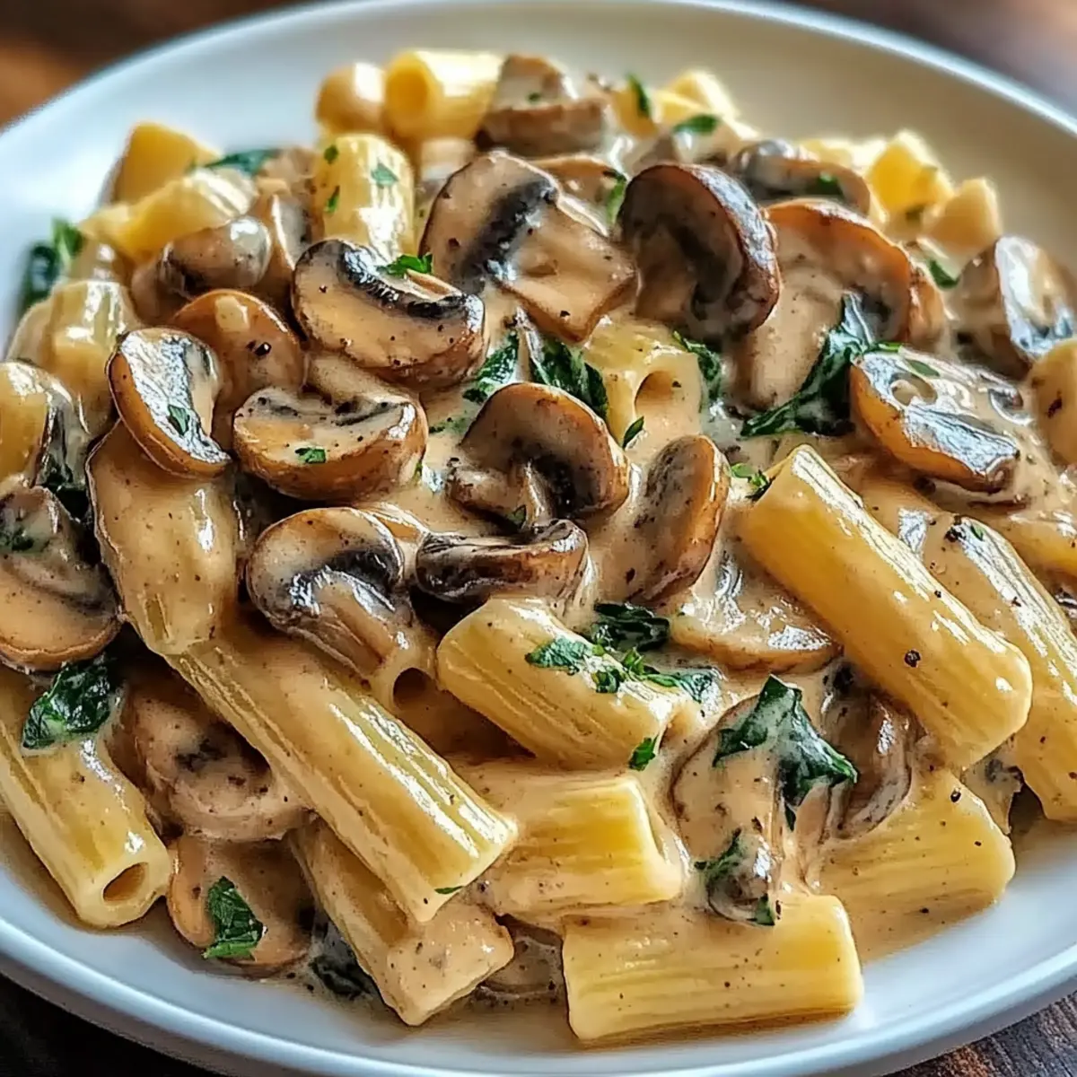 After achieving a lovely golden color on the mushrooms, stir in 3 minced garlic cloves. Cook for an additional minute until the garlic is fragrant but not browned. Then, add a generous handful of fresh spinach to the skillet, cooking until it wilts down—this should take about 2 minutes. The vibrant green color will enhance your Creamy Tuscan Mushroom Pasta Skillet both visually and nutritionally.