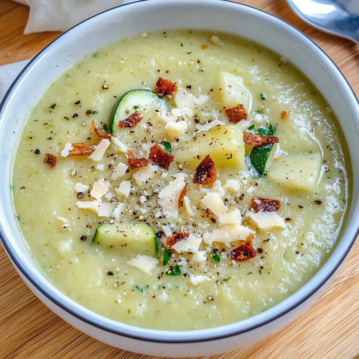 Serve the soup hot, garnished with optional crumbled bacon or shredded parmesan for an extra layer of flavor. As you ladle it into bowls, admire the beautiful creamy texture and vibrant color of your healthy creamy zucchini potato soup—perfect for cozying up on a chilly evening.