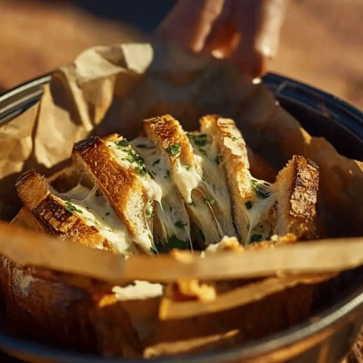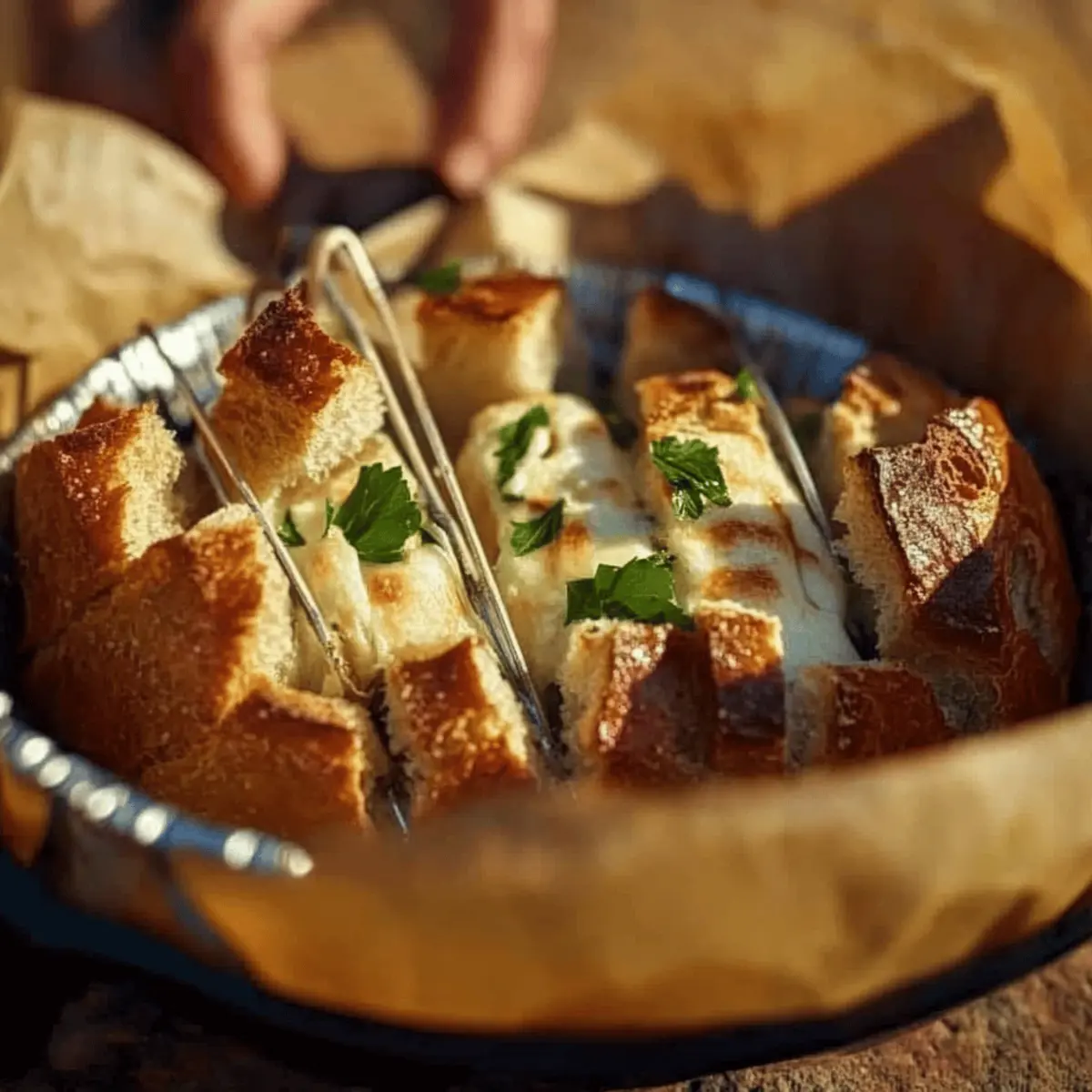 Cutting Technique: When slicing the bread, be careful not to cut all the way through; this method allows for easy pull-apart sections, enhancing the enjoyment of your Dutch Oven Cheesy Pull Apart Garlic Bread.