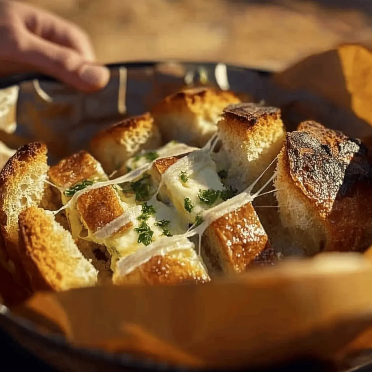 After the cooking time is up, remove the Dutch oven from the heat, taking care to use heat-resistant gloves. Carefully lift the lid to unveil your Dutch Oven Cheesy Pull Apart Garlic Bread—look for melted cheese oozing from the sizzling bread! Sprinkle the top with freshly chopped parsley or basil for a burst of color and flavor, then serve warm. Enjoy the shared experience as everyone digs into this deliciously cheesy creation!