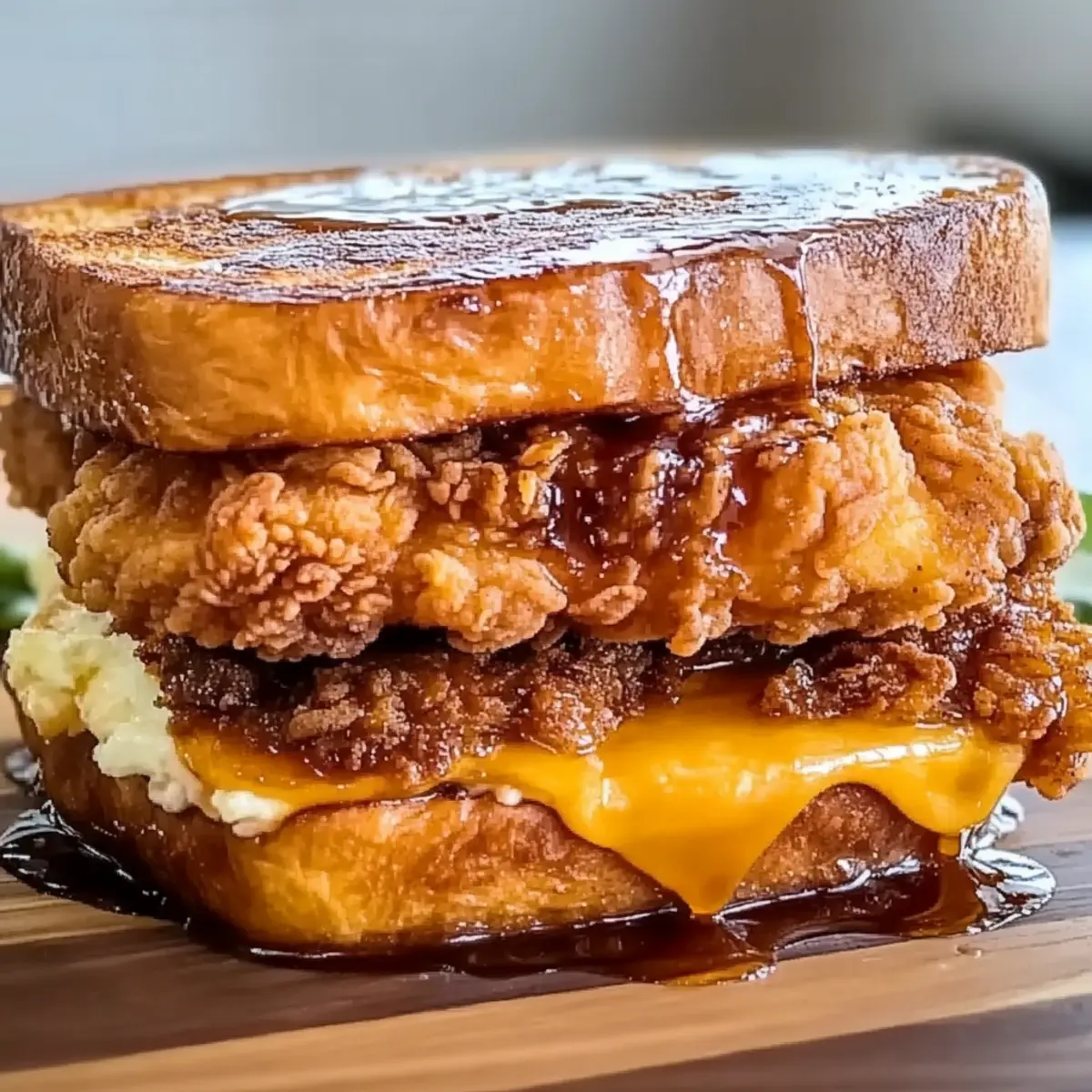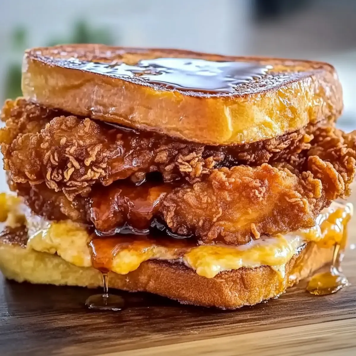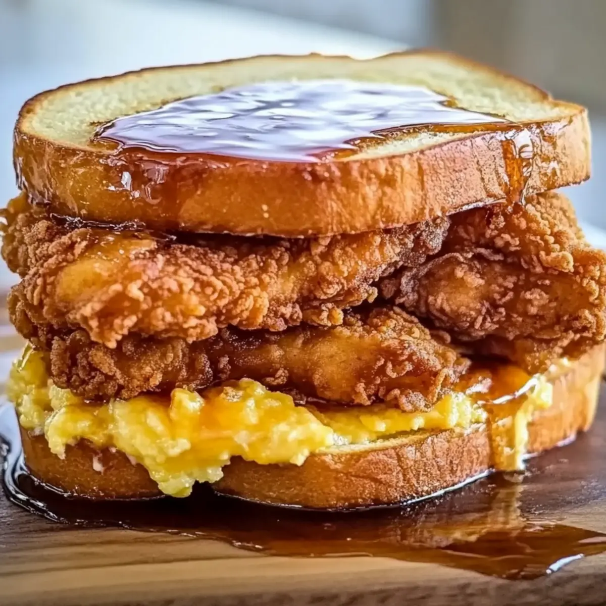 - Assemble the sandwich by layering cooked chicken between slices of French toast, drizzle with maple syrup, and add any optional toppings.