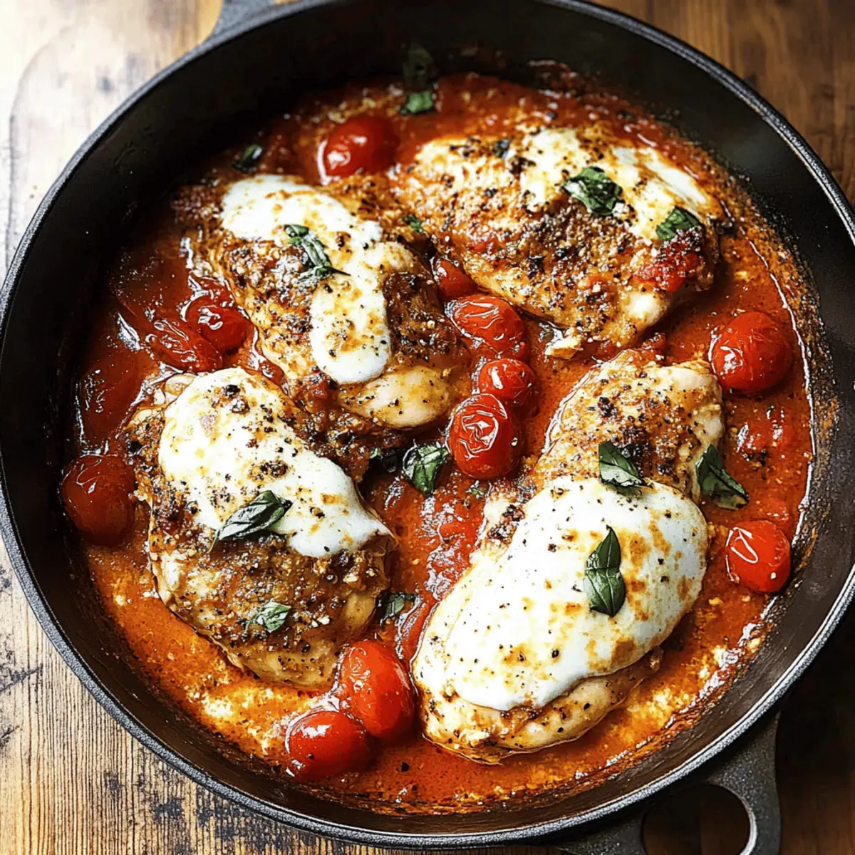 Return the seared chicken to the skillet, spooning some of the sauce over it. Top each fillet with a few basil leaves and a handful of mozzarella balls. Allow it to simmer for another 5 minutes on low heat until the cheese begins to melt, or place the skillet in a preheated oven at 400°F for 10 minutes for a bubbly topping of gooey goodness.