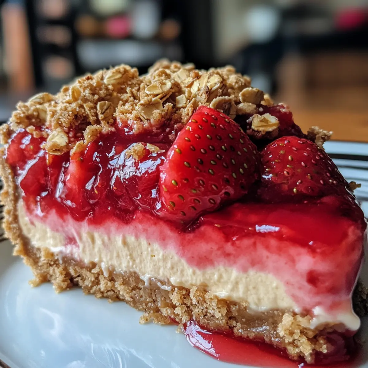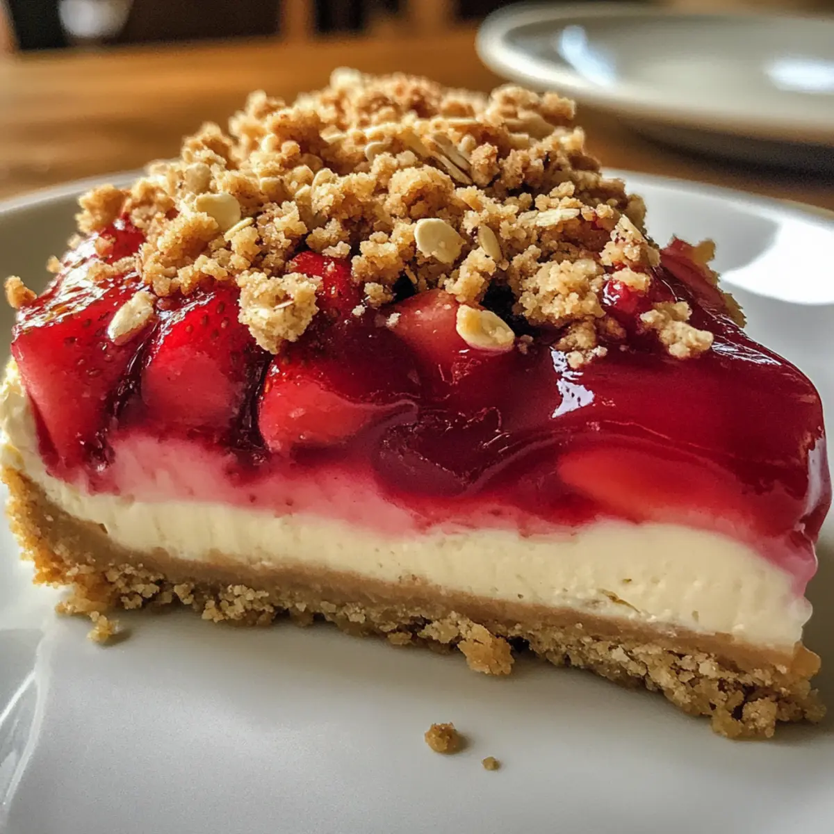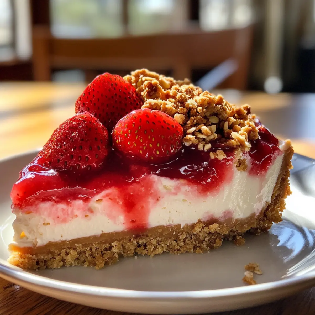 Dynamic Flavor: The tantalizing strawberry sauce combined with the crunchy oat crumble adds crunchy contrast and vibrant freshness, elevating each slice to new heights.