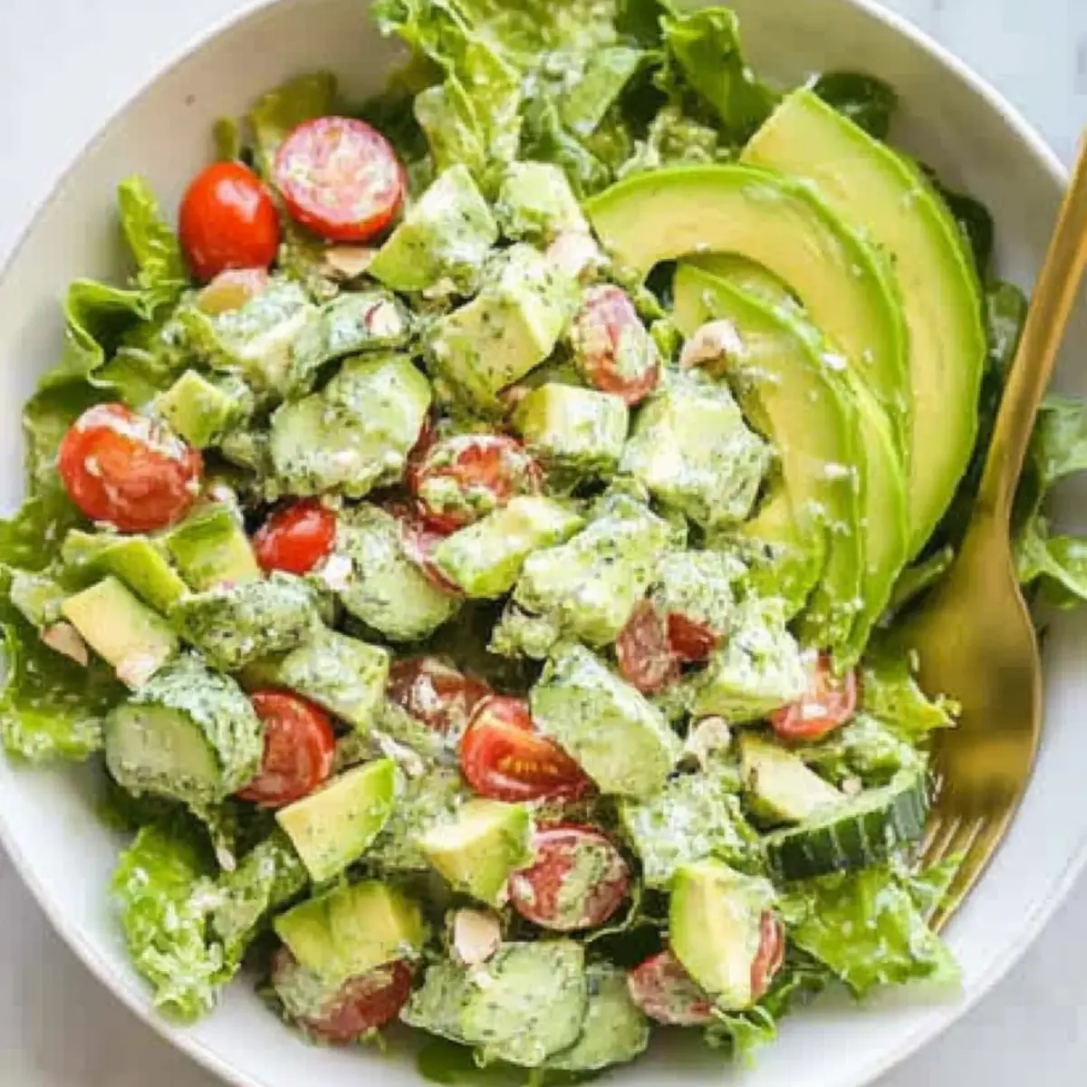 Once your ingredients are prepped, gently add the chopped romaine, cucumbers, and tomatoes into the mixing bowl. Carefully layer the avocado slices on top to maintain their shape. Make sure the ingredients are evenly distributed, bringing together the fresh flavors that will make this Green Goddess Salad so delicious.
