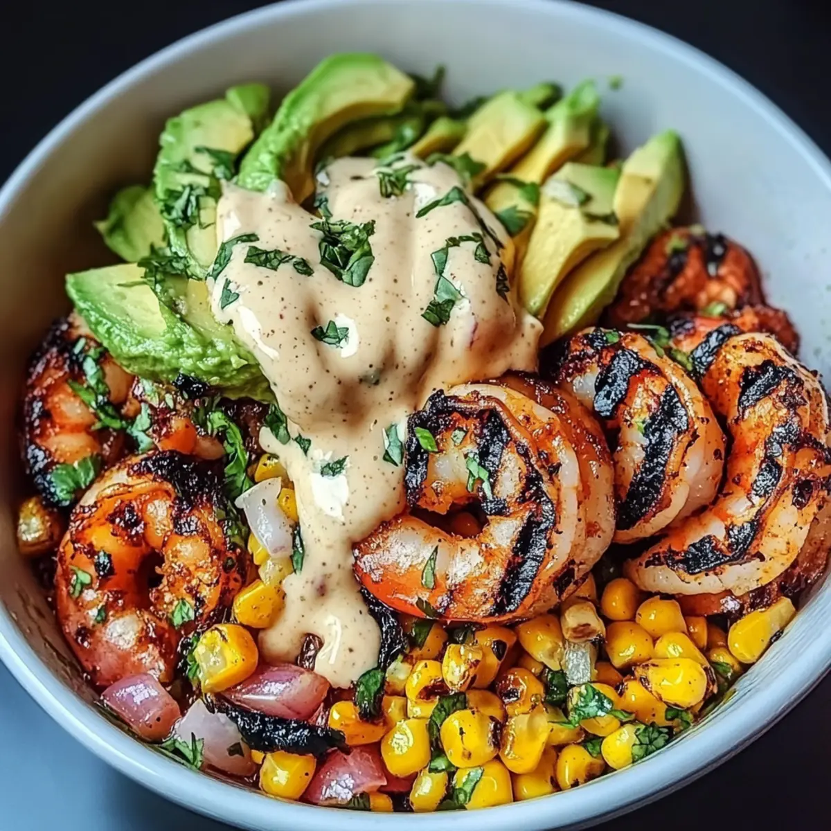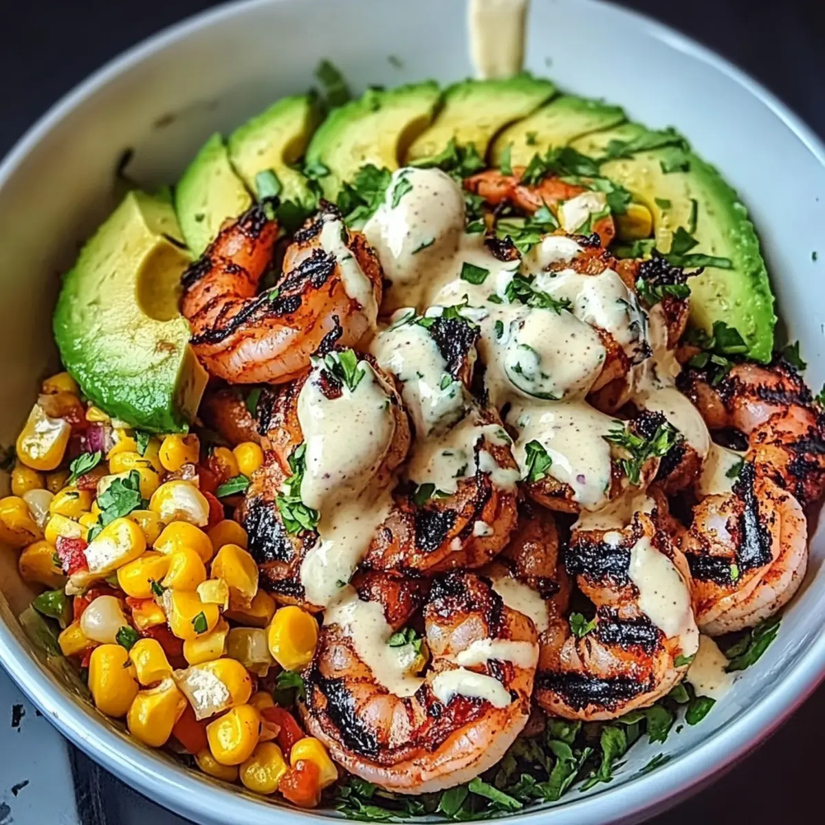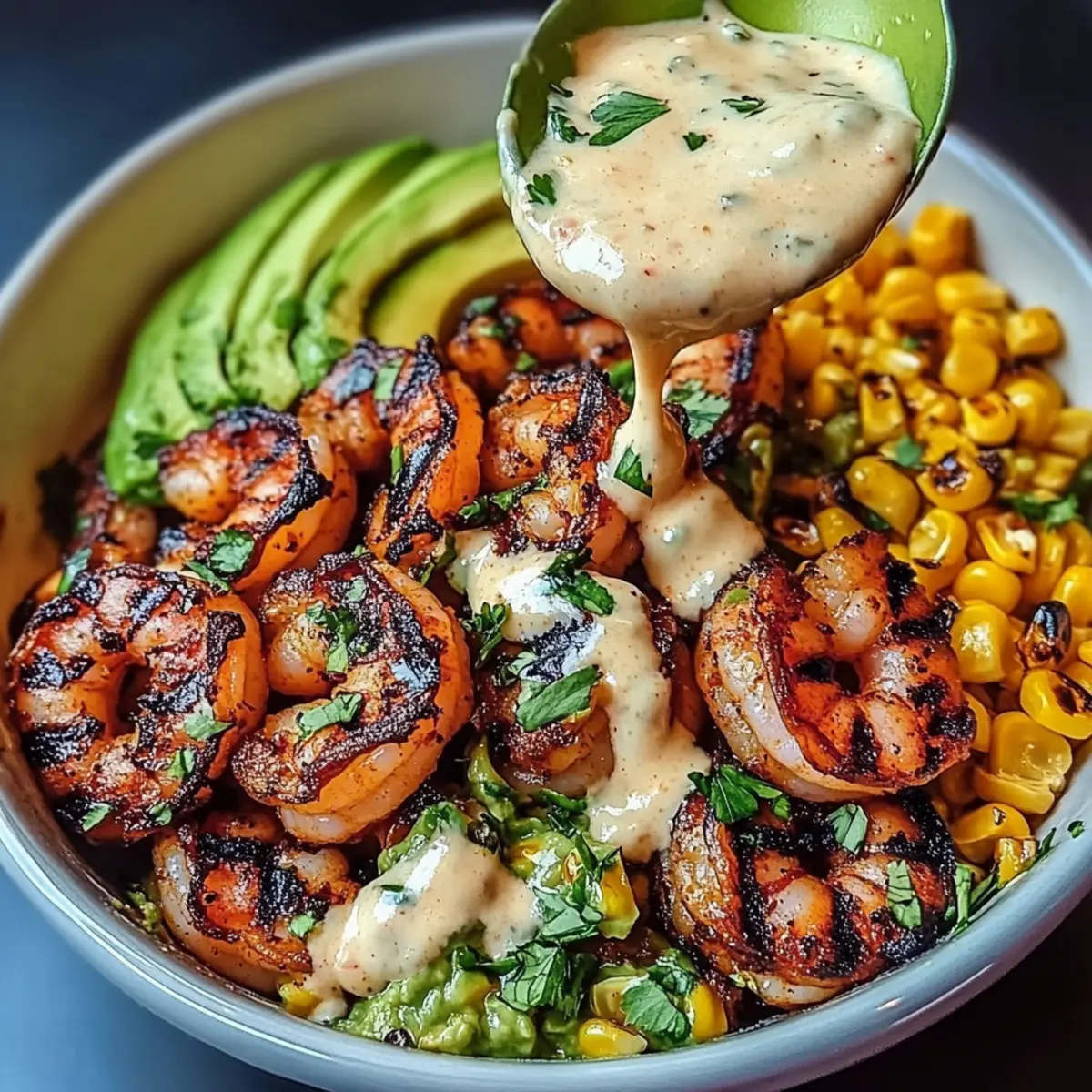 5. Assemble Bowls: Divide corn salsa into bowls, top with grilled shrimp, avocado slices, creamy sauce, and garnish.