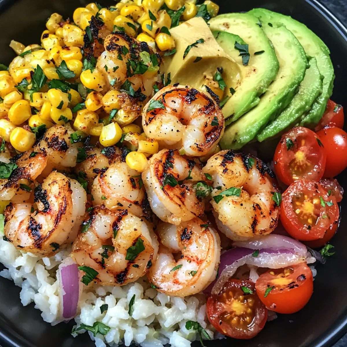 - Prepare bowls with cooked rice, then top with grilled shrimp, corn salsa, and sliced avocado.