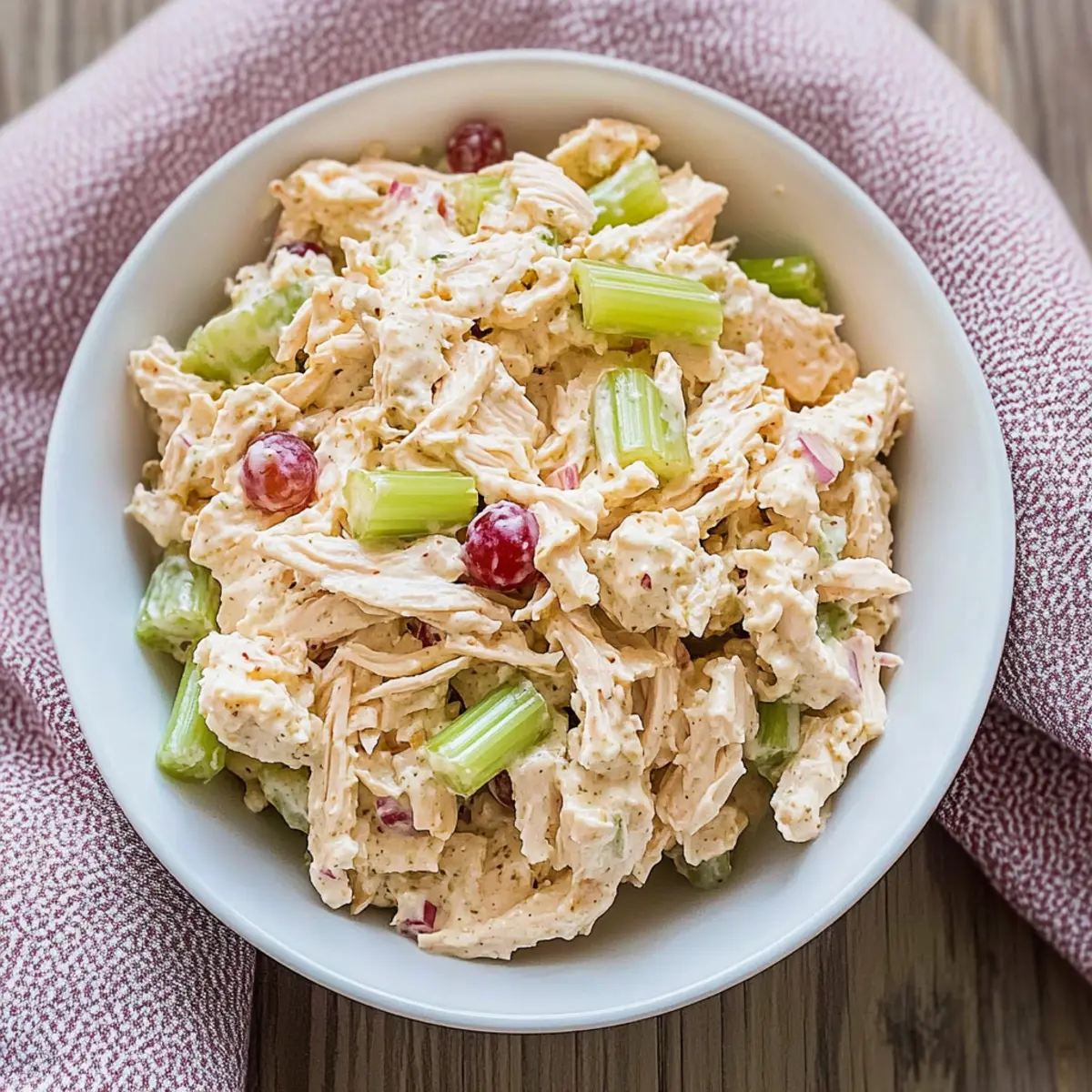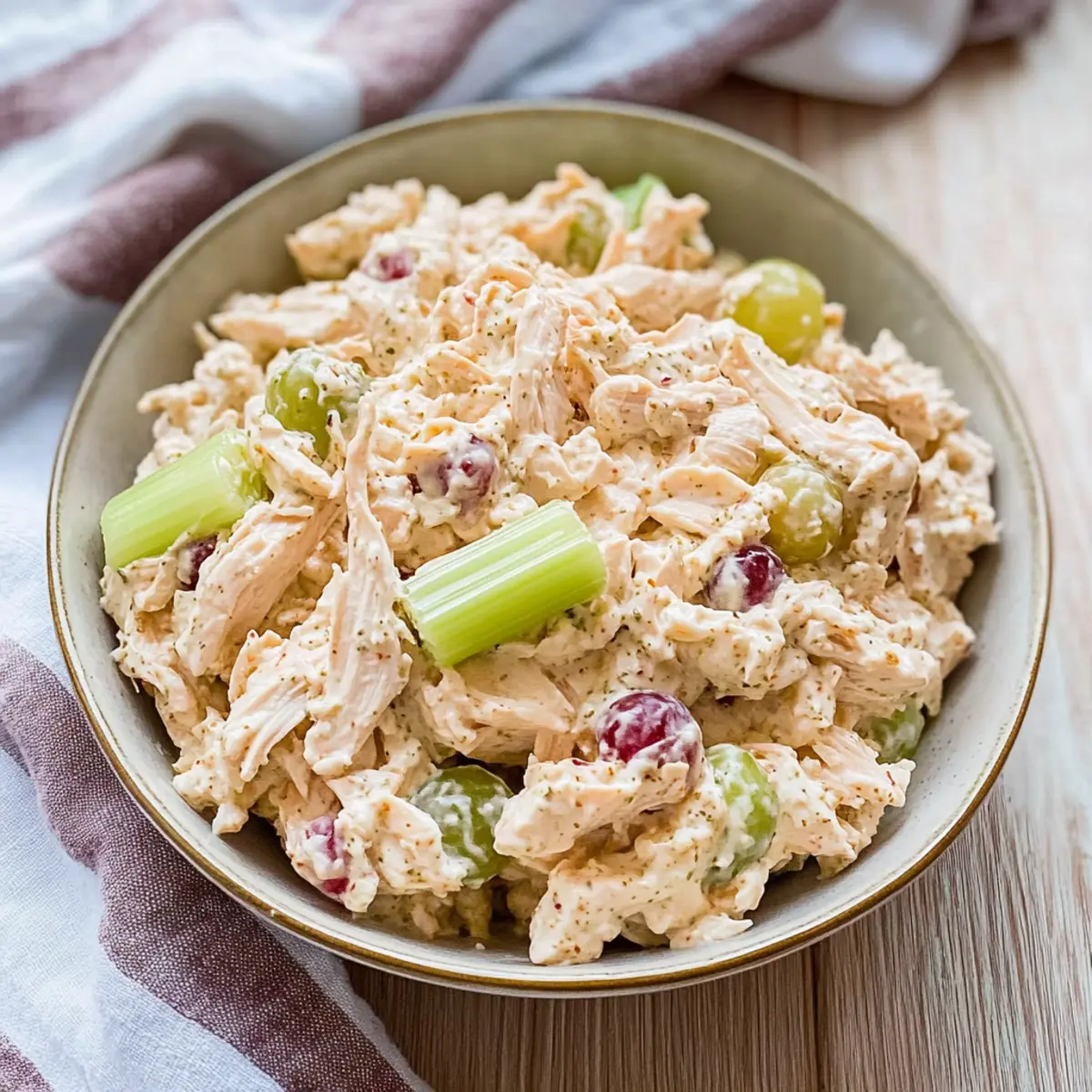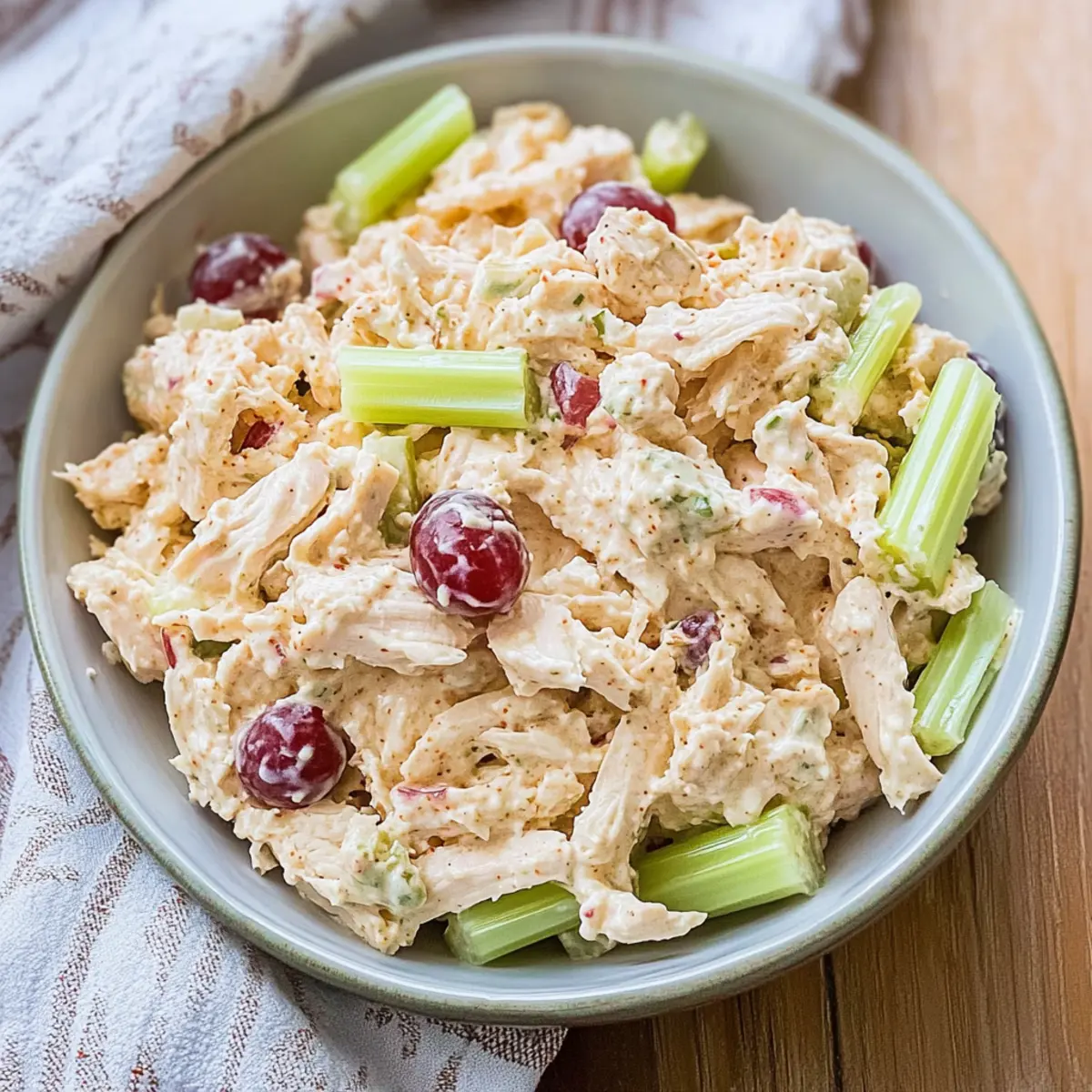 - In a large mixing bowl, combine the shredded chicken, creamy mixture, diced celery, and grapes. Toss gently to combine.