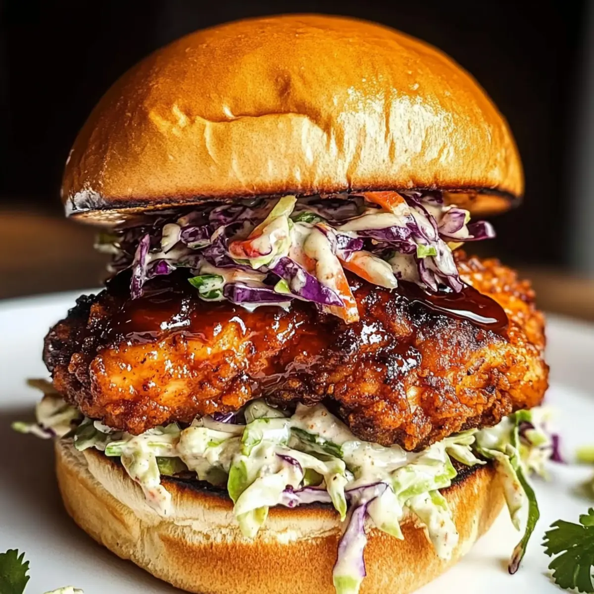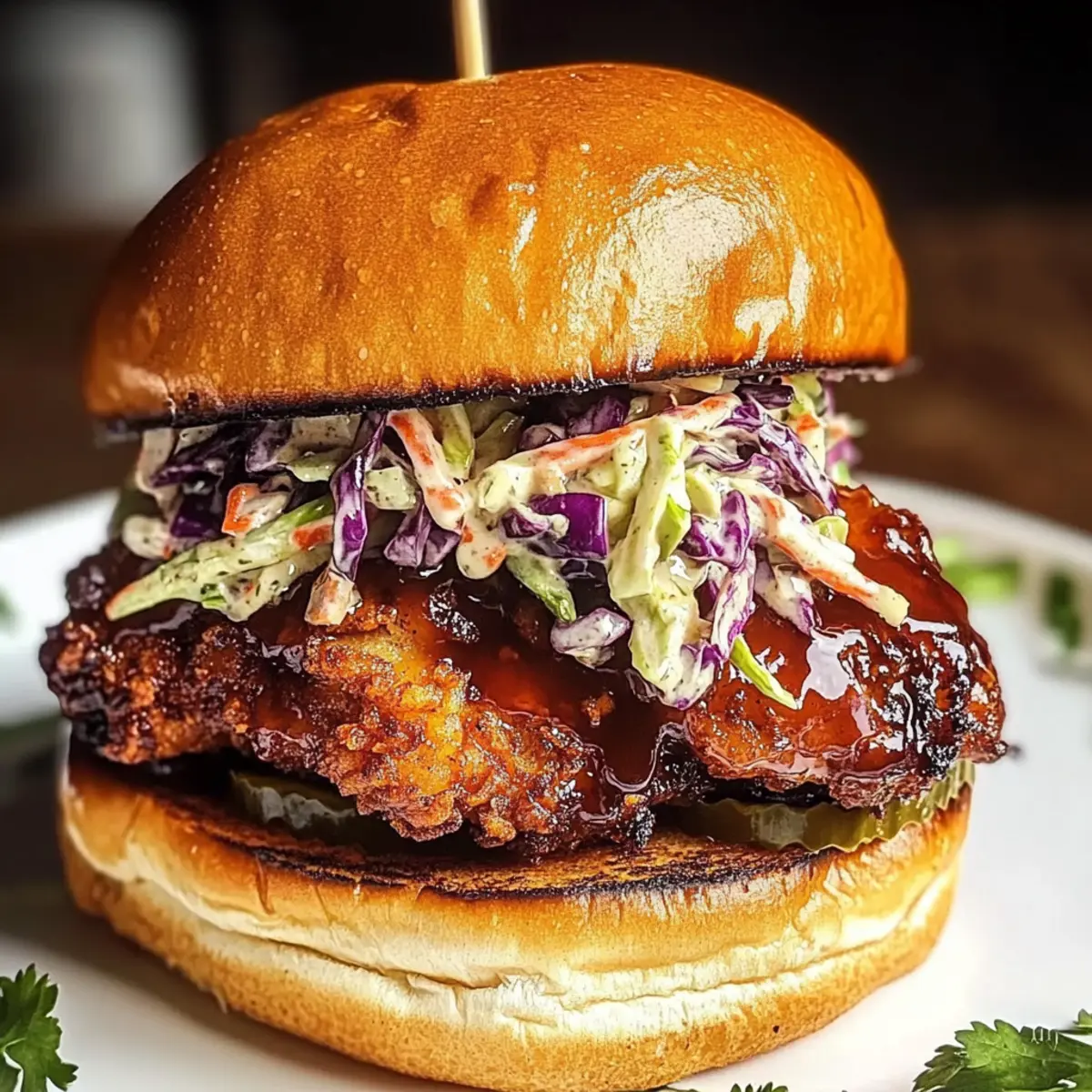 - Assemble sandwiches by brushing crispy chicken with sauce, placing on toasted brioche buns, topping with slaw and pickle chips, and serving immediately.