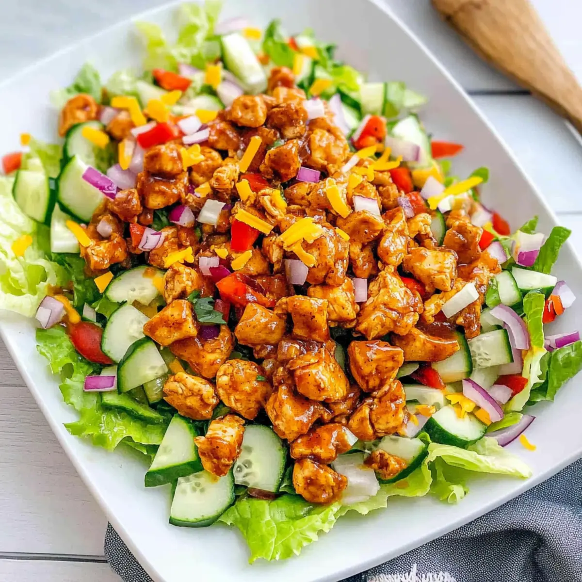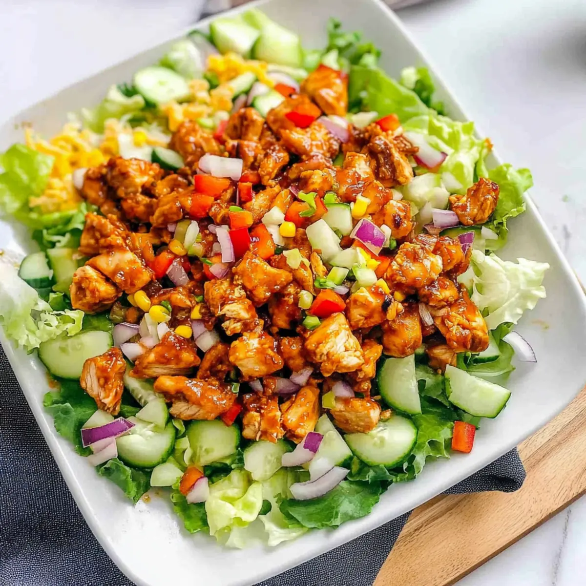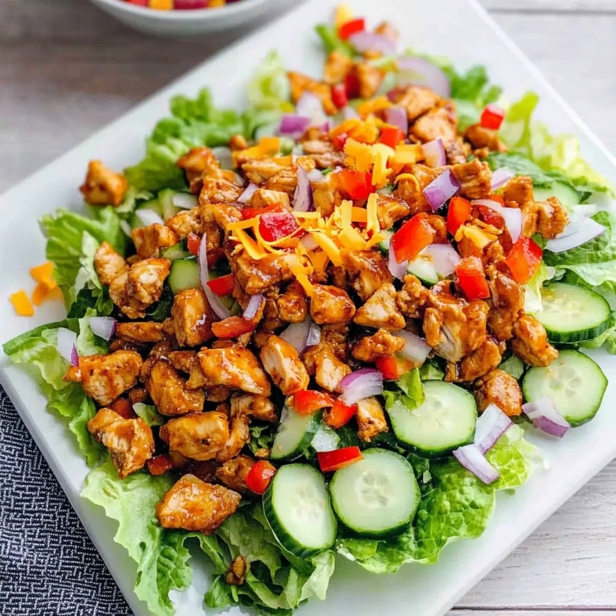 Transfer the dressed romaine lettuce onto serving plates, creating a colorful base for your salad. Layer in diced red onion, sweet red bell pepper, and refreshing cucumber for a delightful crunch. Arrange the vegetables in an appealing manner, ensuring each plate showcases the vibrant colors of your Honey Hot Chicken Salad.