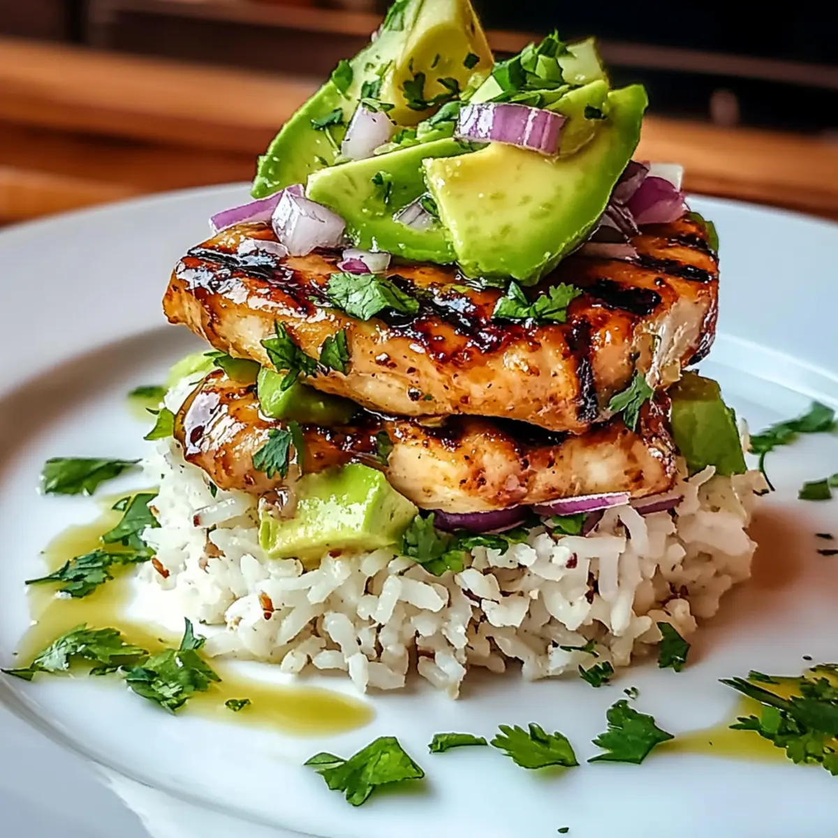 - Assemble the Stack: In a serving plate, place a portion of jasmine rice, layer with sliced grilled chicken, and a scoop of avocado mixture.
