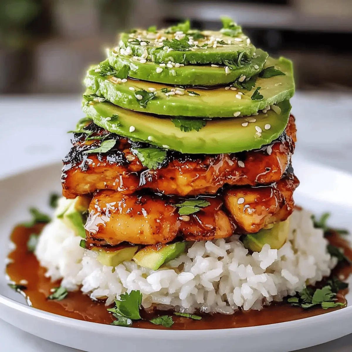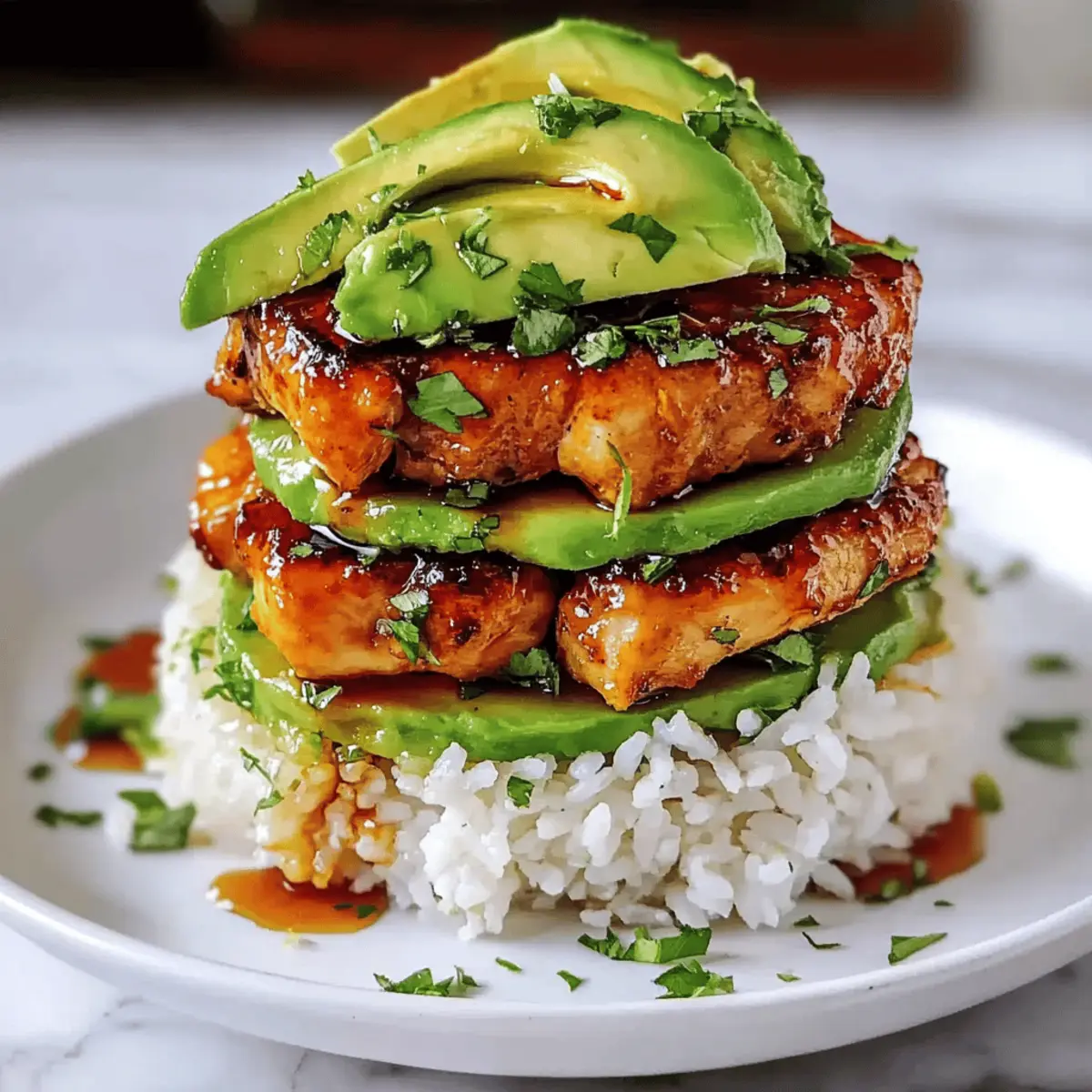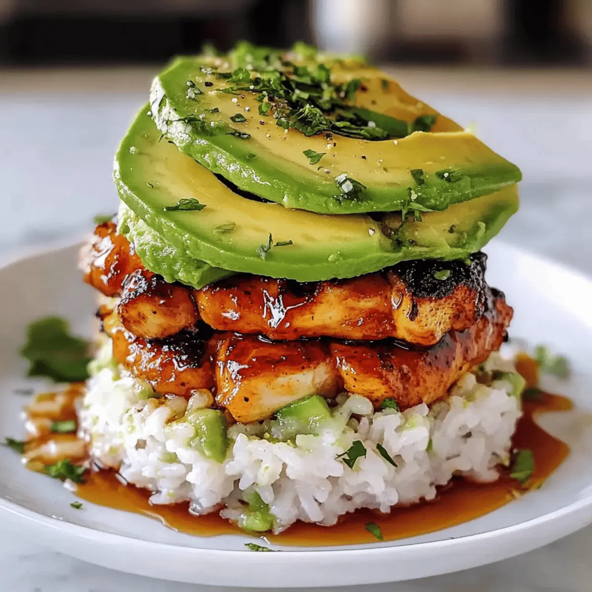 Flavorful Layers: Each bite of this Honey Lime Chicken & Avocado Rice Stack is a treat, featuring sweet honey and zesty lime that complement the savory chicken beautifully.