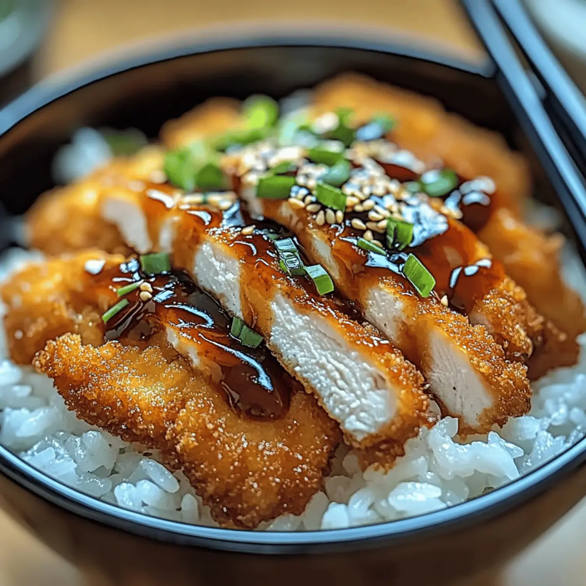 - To assemble your bowls, place a serving of cooked rice in each bowl, slice the chicken into strips, and lay them over the rice. Drizzle with tonkatsu sauce and garnish with green onions and sesame seeds.