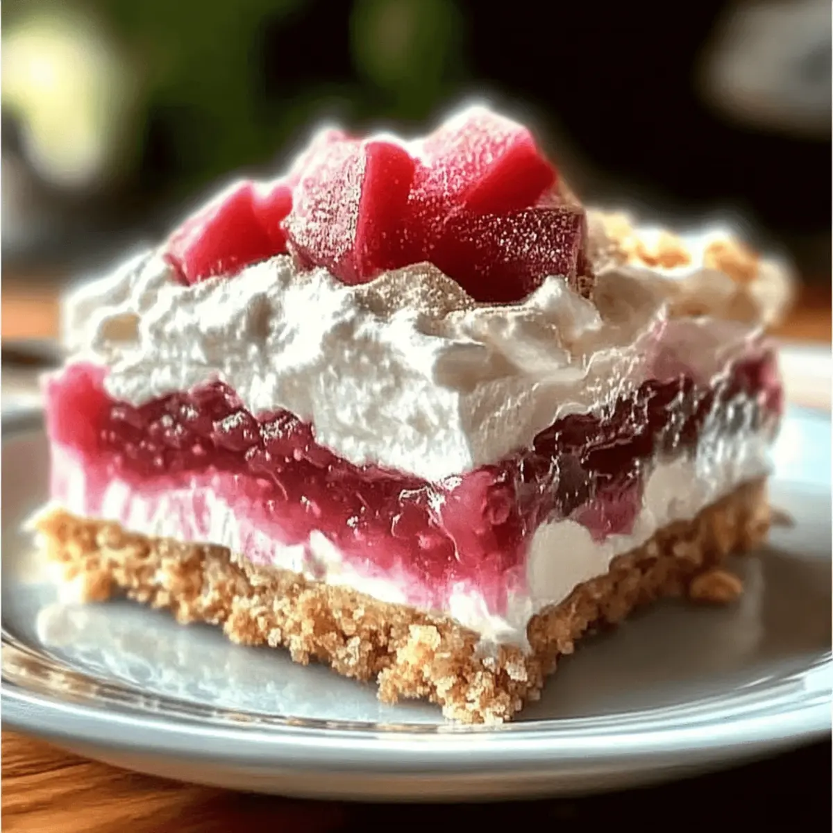 - Spread remaining whipped topping over the rhubarb layer, creating peaks for decoration.