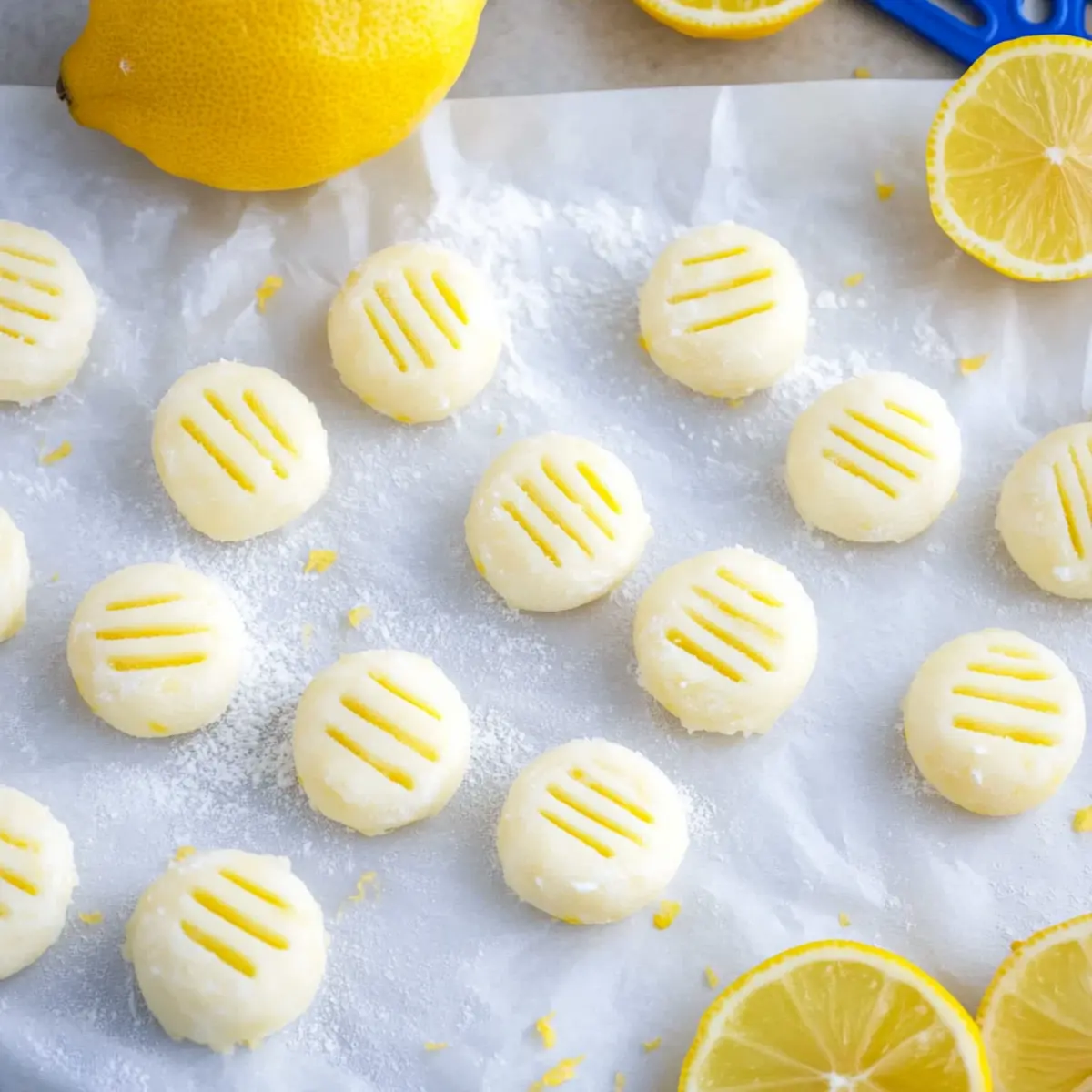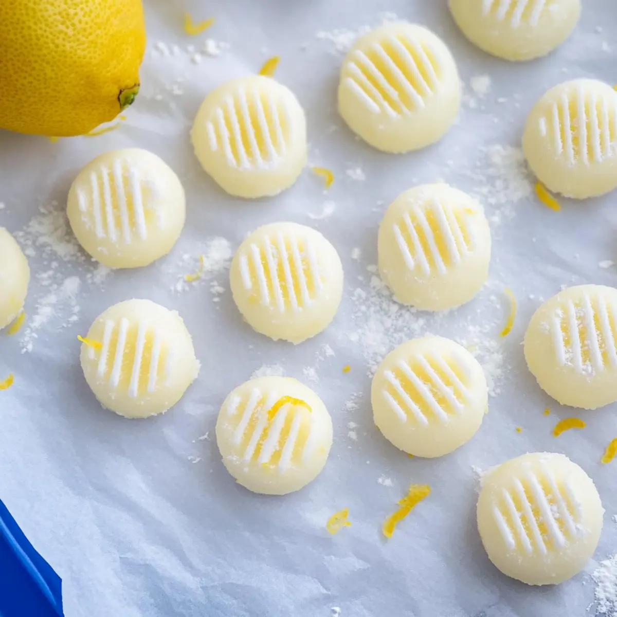 Using your hands, scoop out small portions of the dough and roll them into 1/2-inch balls. Place each ball on a parchment-lined baking sheet, leaving a bit of space between them for easy handling. The mints should look smooth and glossy at this stage, showcasing the delightful lemon flavor about to shine through as they set.