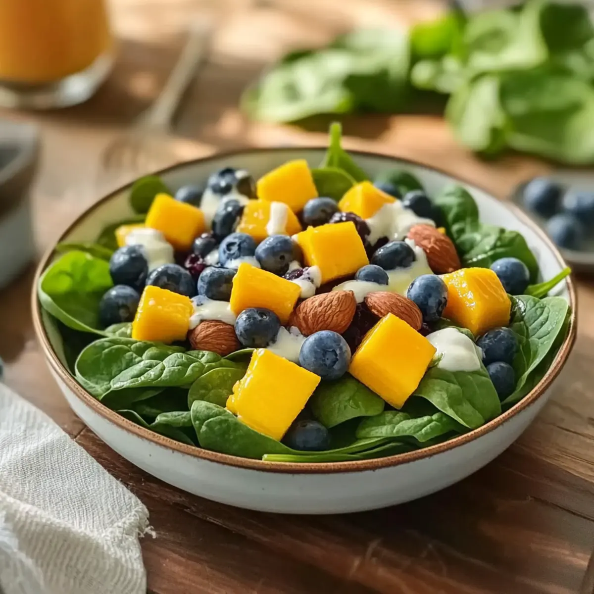 Freshness, Bright Flavors: The Mango Blueberry Spinach Salad combines the juicy sweetness of ripe mango and blueberries with crisp spinach for a delightful taste experience.