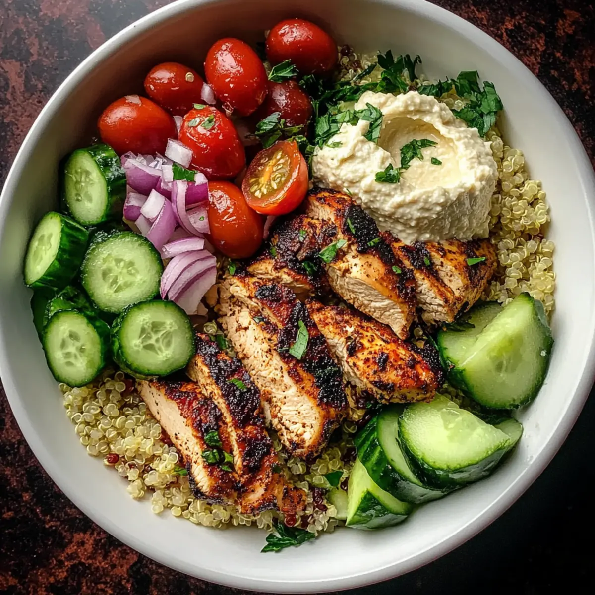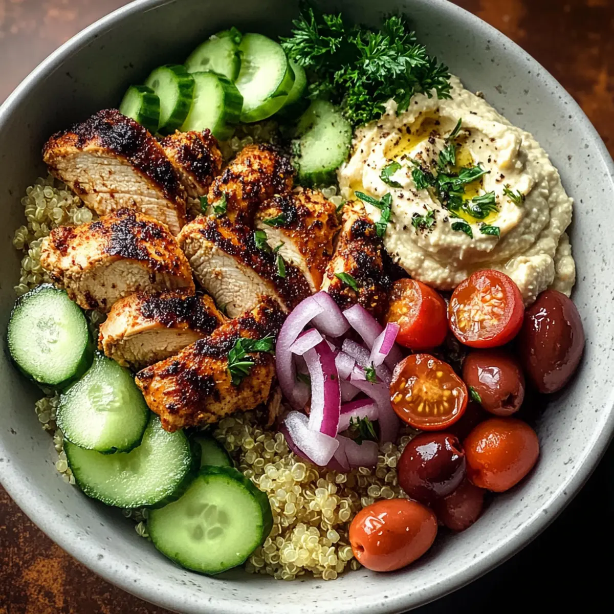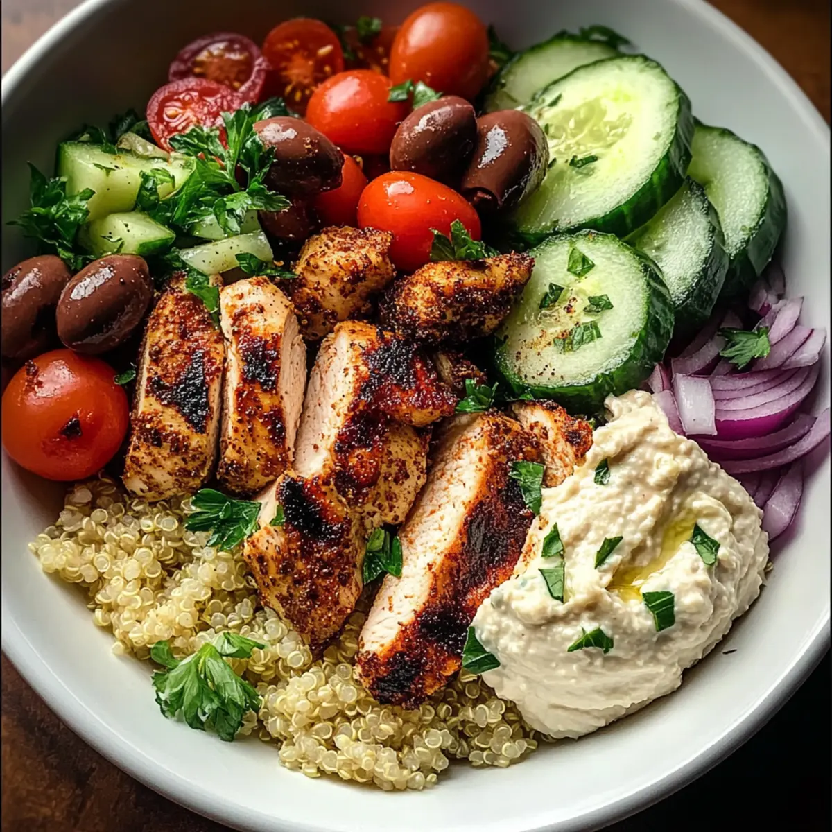 Include a dollop of hummus on the side for an extra creamy texture and garnishing touch. Sprinkle fresh parsley over your Mediterranean chicken bowl to not only brighten the dish visually but also elevate its flavor profile. This step brings everything together, ensuring a delightful dining experience.