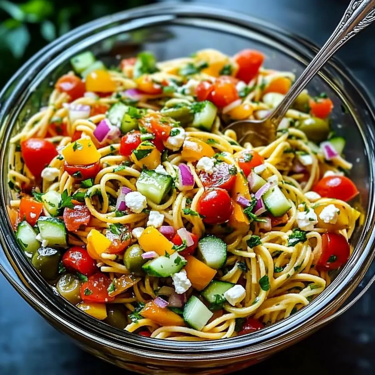 Your Mediterranean Pasta Salad is ready to shine! Serve immediately for the freshest taste, or for a more intense flavor experience, chill it in the refrigerator for about 30 minutes before serving. This allows the flavors to meld beautifully, making it an ideal dish for gatherings or meal prep.