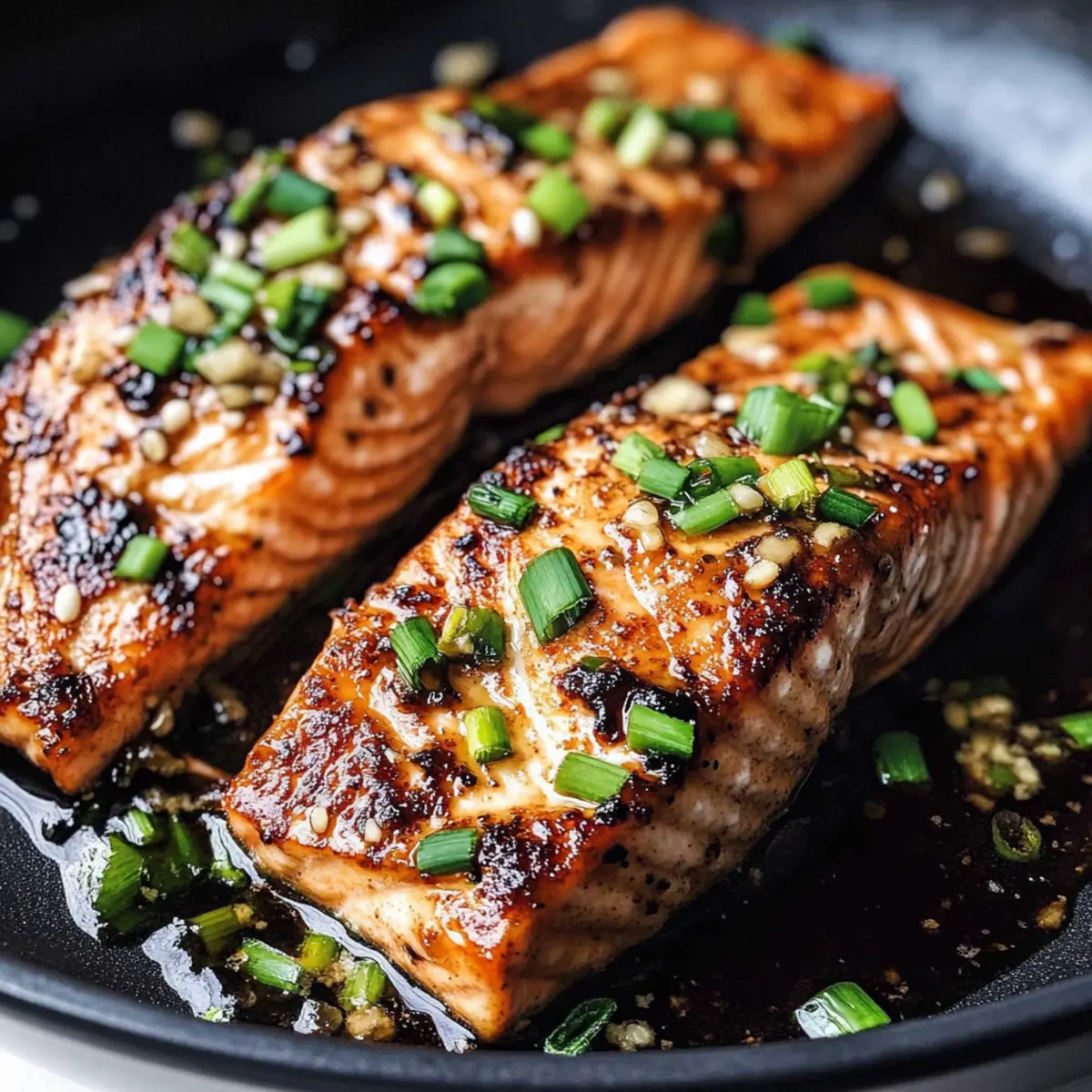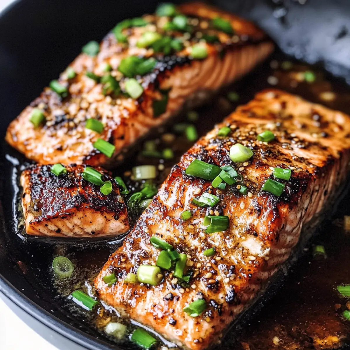 - Transfer the cooked salmon to a serving platter, drizzle with remaining miso butter, and garnish with additional green onions and sesame seeds.