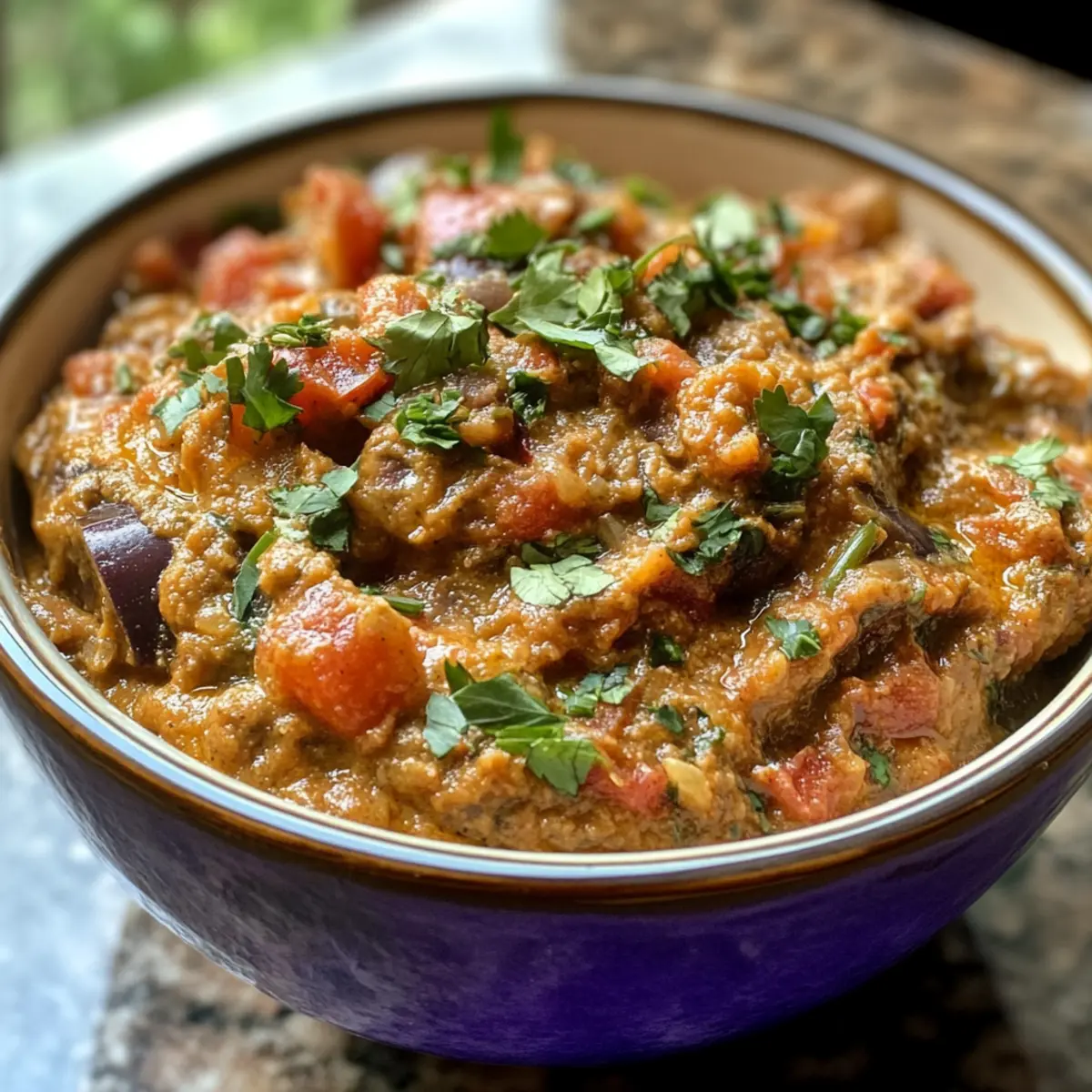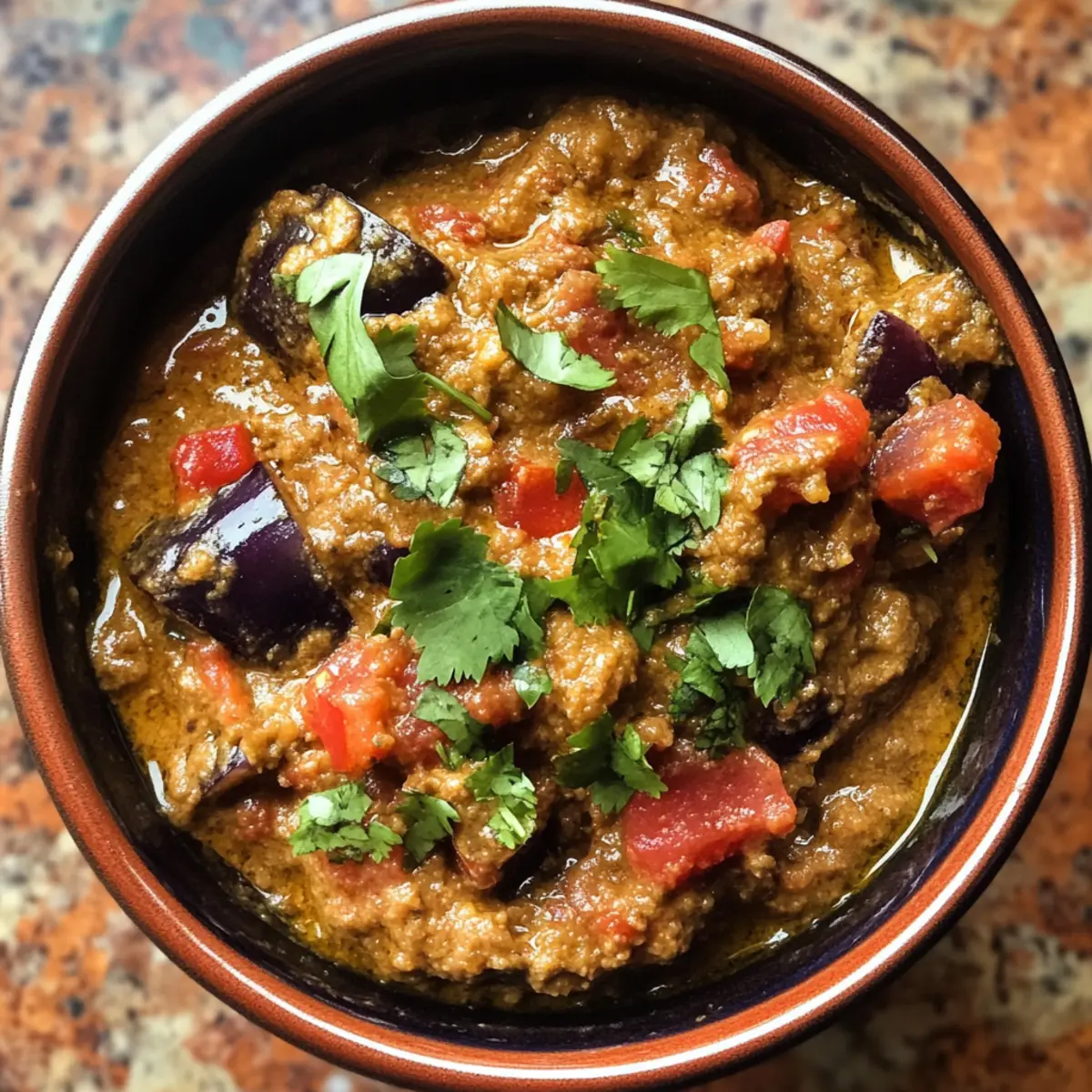 Once your eggplants are roasted and cooled enough to handle, scoop out the flesh and mash it in a bowl. Add this mashed eggplant to the cooked tomato mixture in your skillet, along with the chopped cilantro. Stir well to combine and continue cooking over low heat for an additional 10–15 minutes, allowing the flavors to develop.