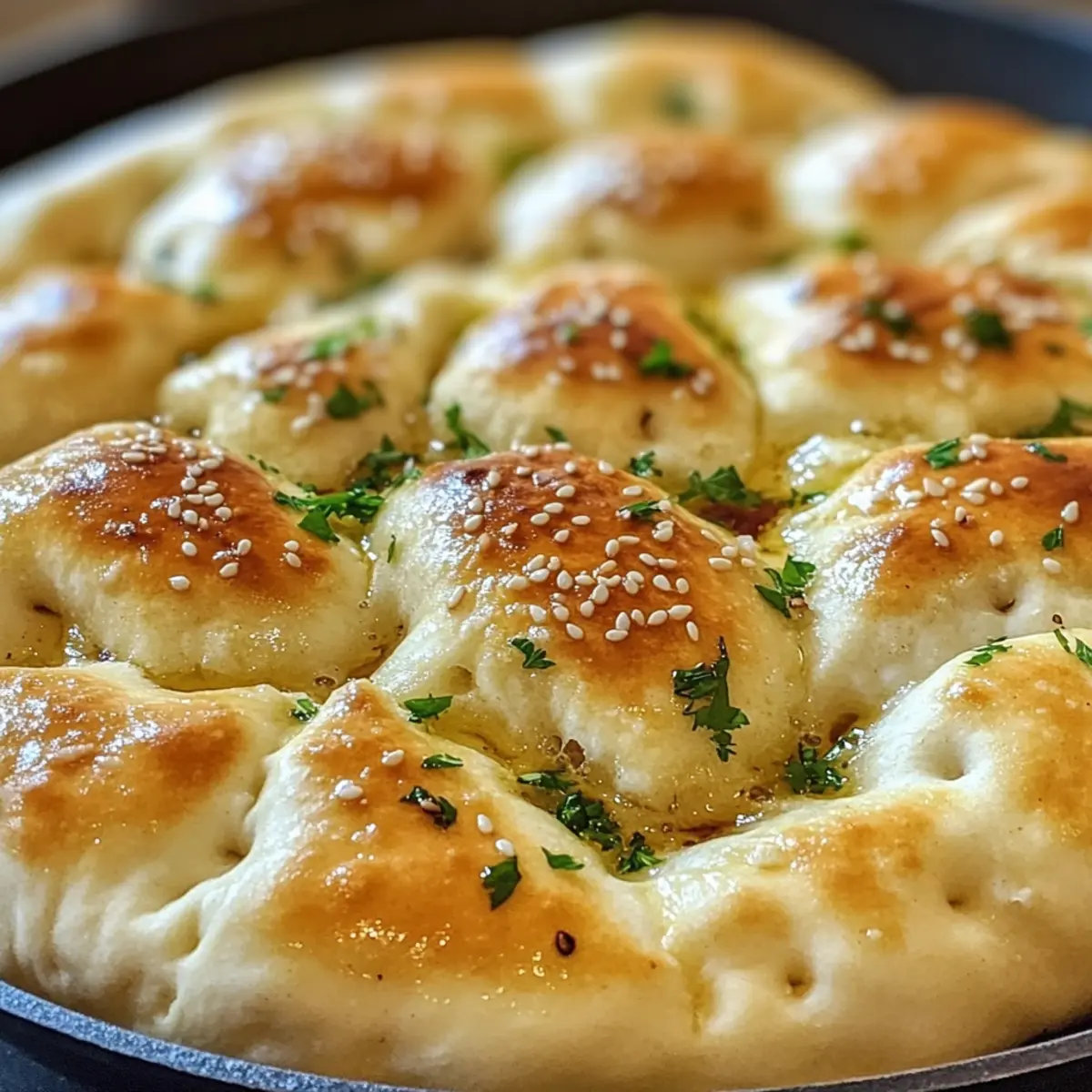 Once cooked, transfer the No-Oven Turkish Bread to a plate and brush the tops with melted butter for extra richness. If desired, sprinkle with minced garlic, sesame seeds, or fresh herbs for added flavor. Serve warm and enjoy this delightful flatbread alongside your favorite dips or meals!
