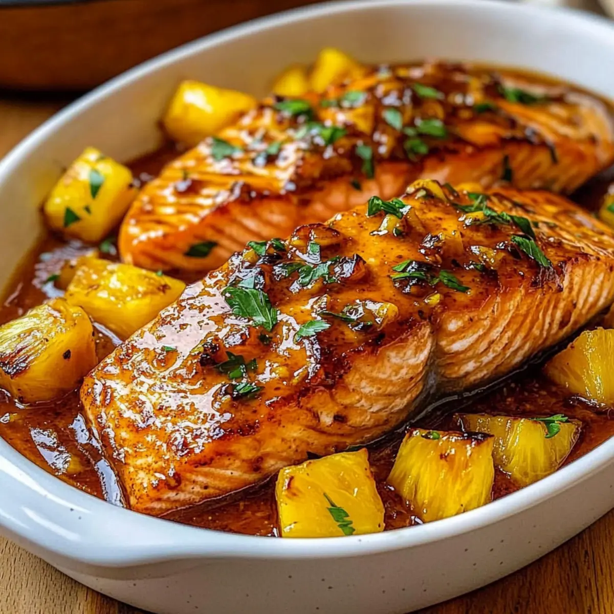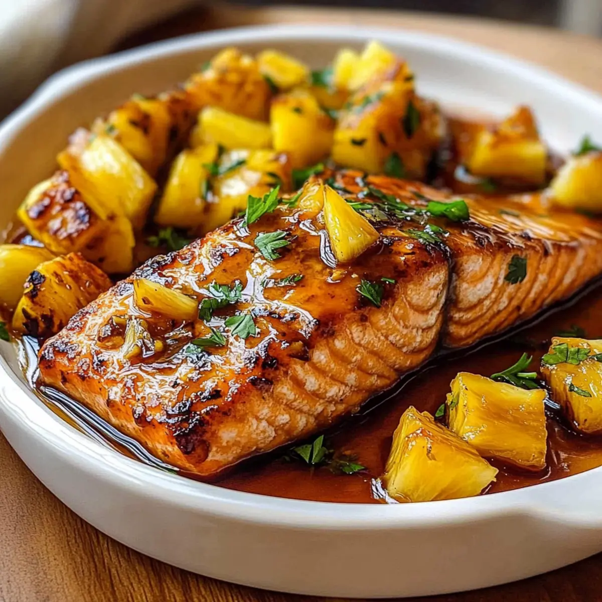 Remove the baking dish from the oven and let the salmon rest for about 5 minutes. This allows the juices to redistribute, resulting in a moist and tender piece of fish. Garnish with freshly chopped parsley before serving, and drizzle the pan juices over the top for an irresistible finish to your Pineapple Glazed Salmon.