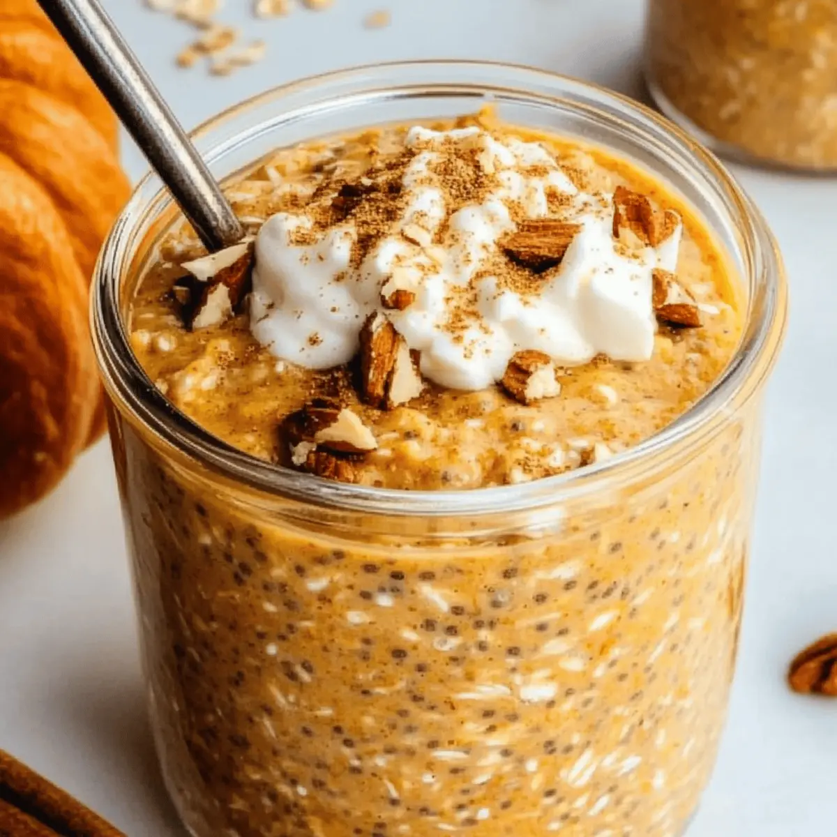Delight in a comforting bowl of Pumpkin Pie Overnight Oats with Chia, a high-protein, gluten-free breakfast.
