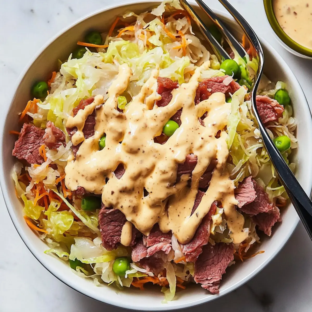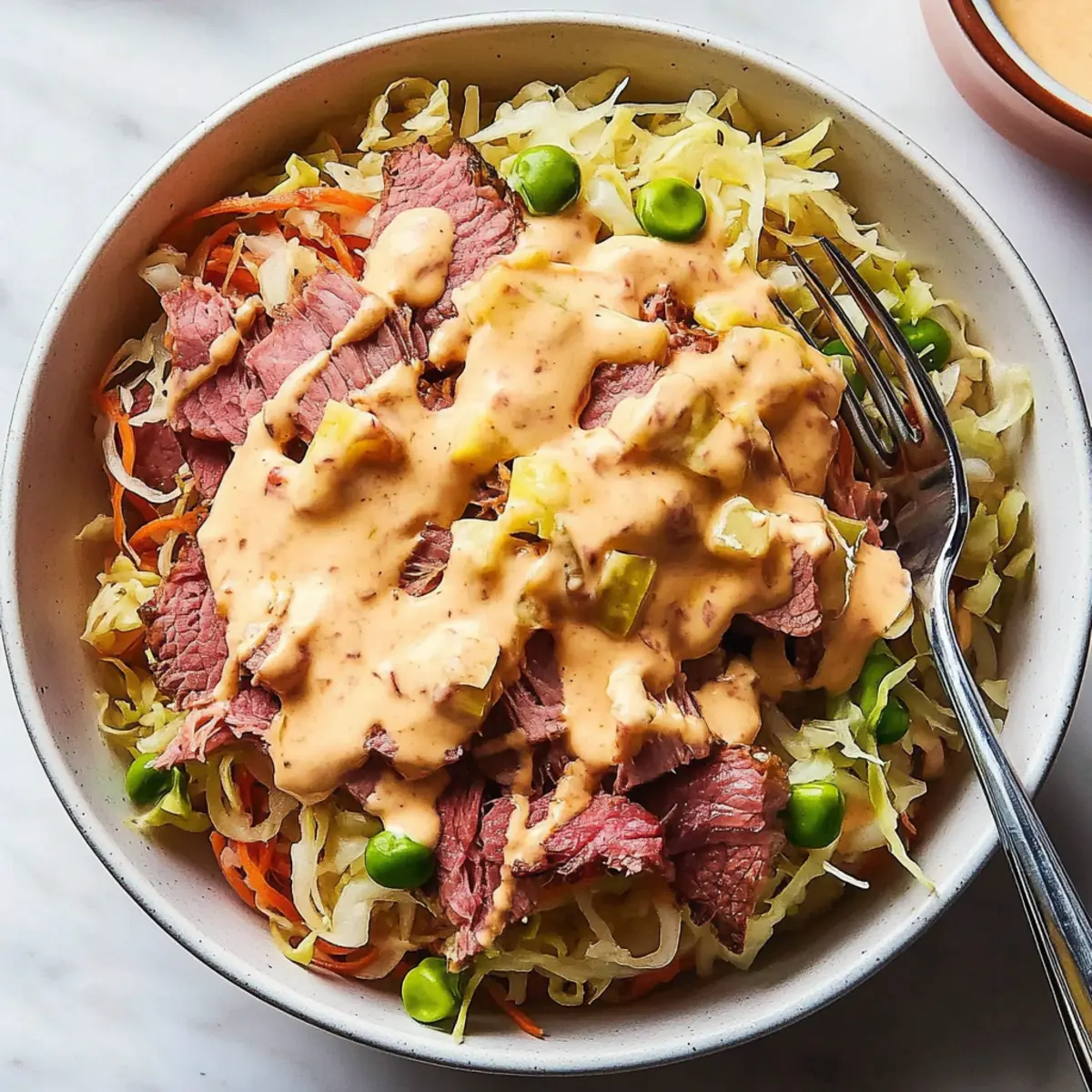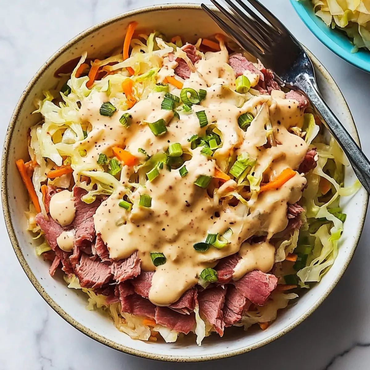 Enjoy a healthy twist on Reuben sandwiches with these Low-Carb Reuben Bowls, featuring corned beef, cabbage, sauerkraut, and creamy dressing.