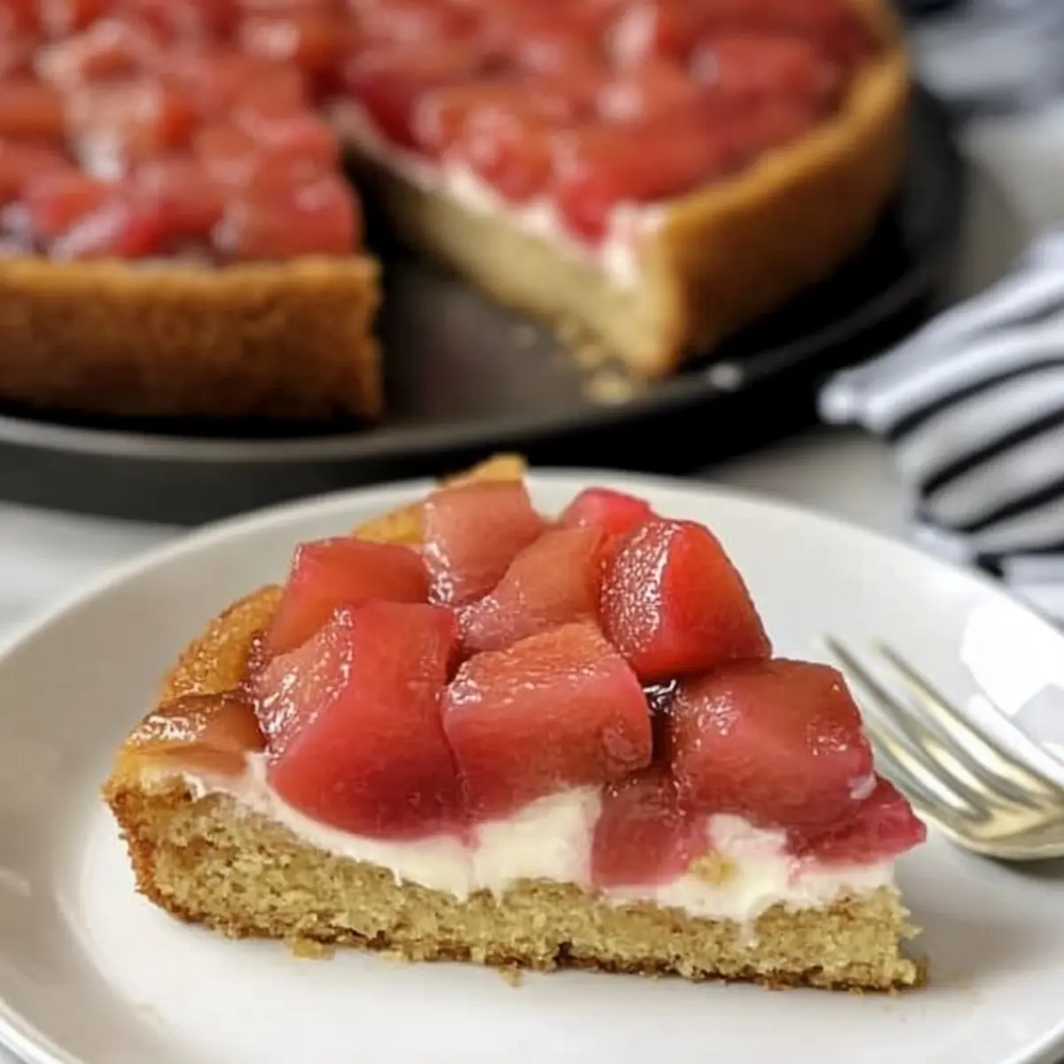 Strawberry Compote: Bright and fruity, a warm strawberry compote drizzled over each slice adds freshness and a pop of color. The sweetness of strawberries harmonizes perfectly with the cake’s tart rhubarb topping.
