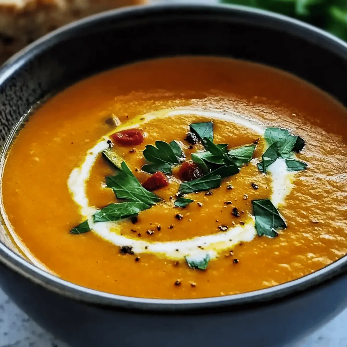 Comforting and vibrant, a bowl of Roasted Veggie Soup invites a delightful dining experience with complementary flavors and textures.