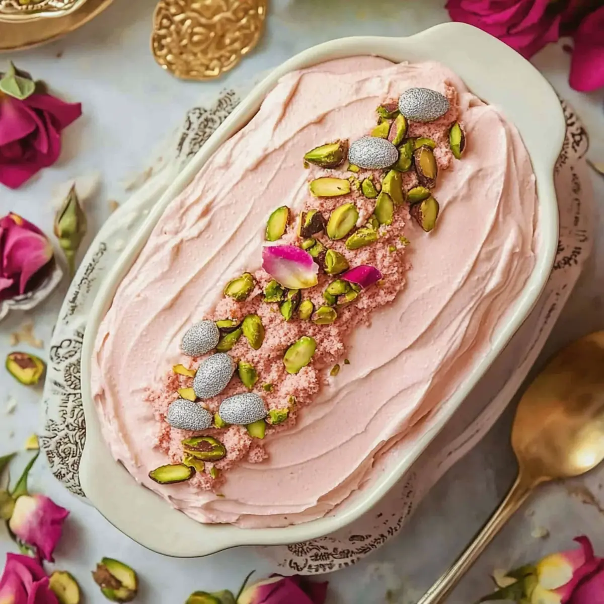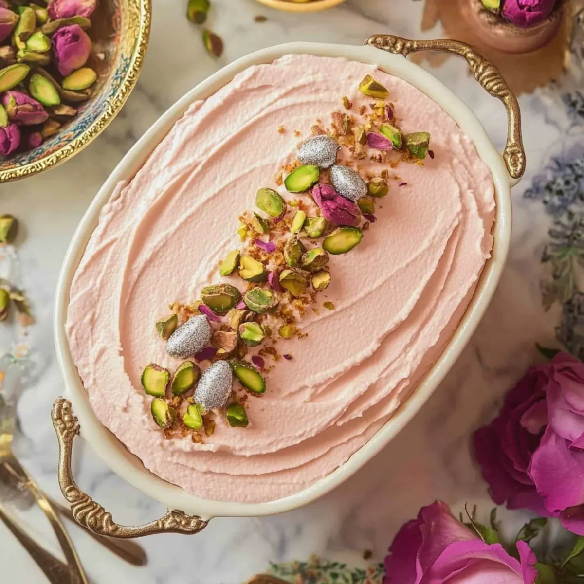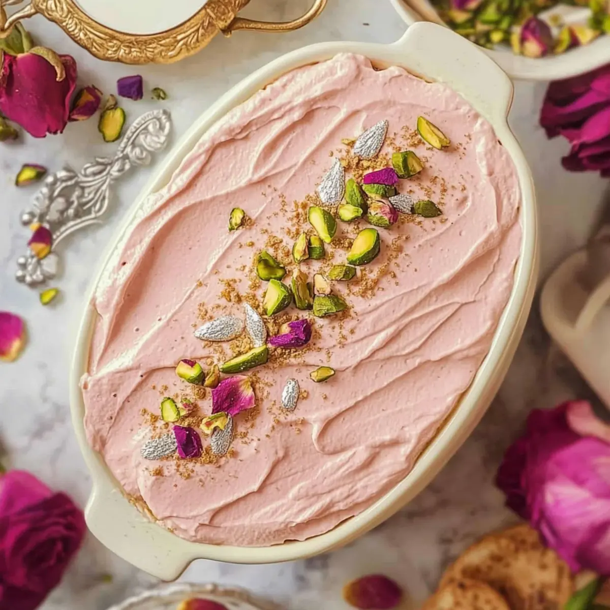 - Remove from fridge, pipe whipped cream on top if desired, and garnish with rose buds and pistachios before serving.