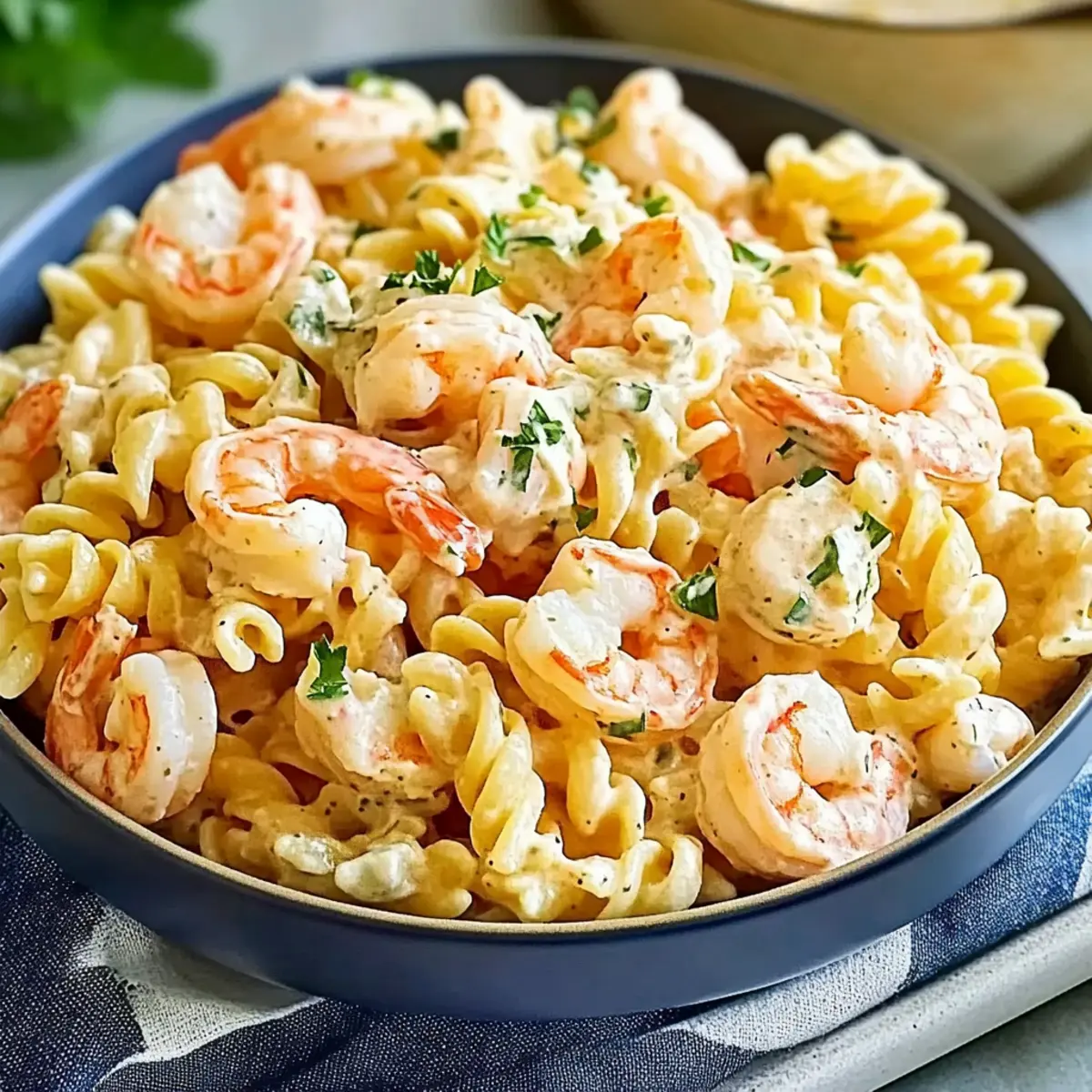 - In a large bowl, combine cooled pasta, shrimp, imitation crab, and chopped vegetables. Pour dressing over and toss gently.