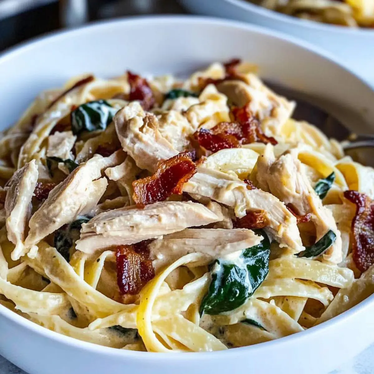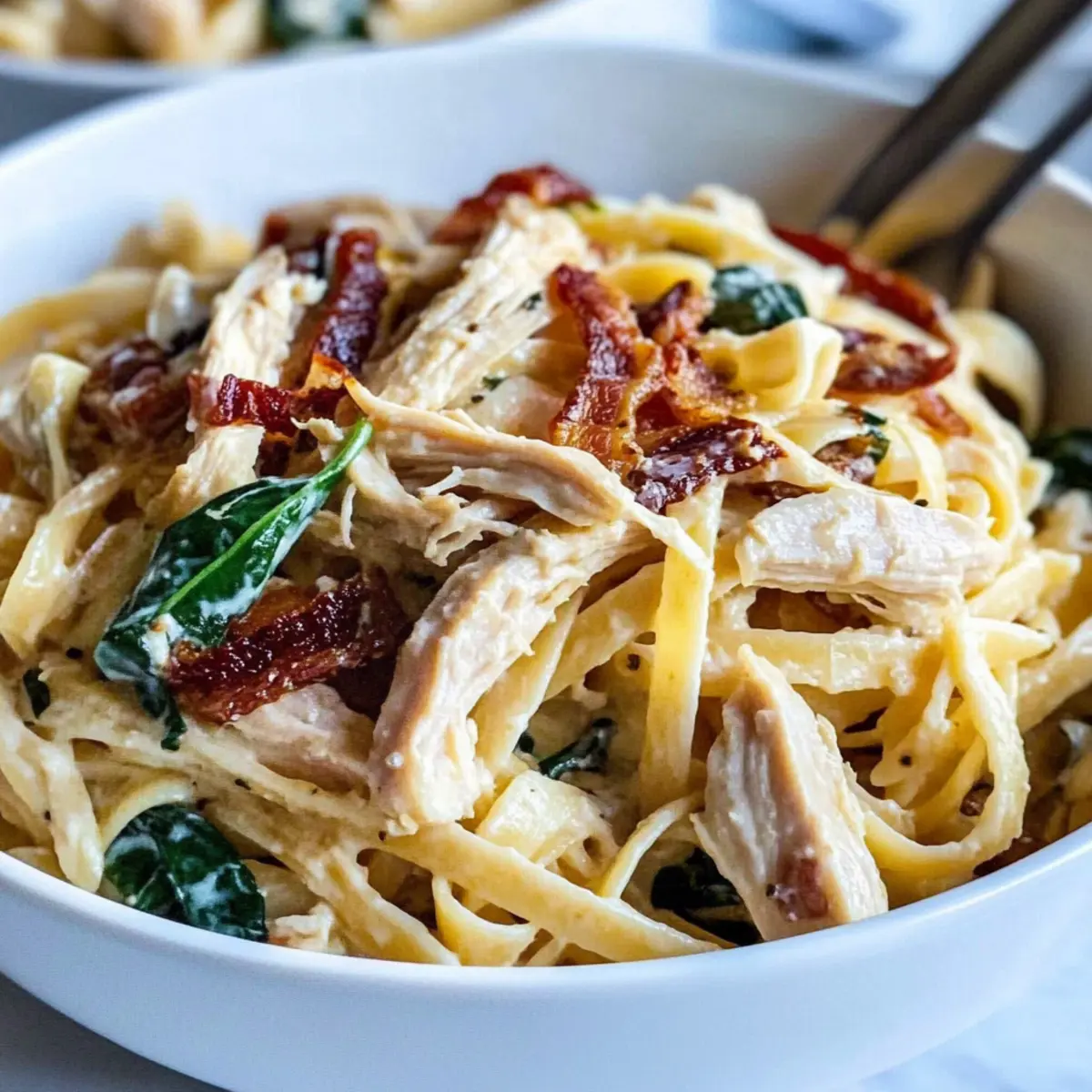 As I stirred the simmering pot, the delightful aroma of garlic and buttery sauce filled my kitchen, instantly transporting me to a cozy Italian trattoria. This Creamy Shredded Chicken Pasta with Spinach and Sun-Dried Tomatoes is everything you could wish for in a meal—comforting, creamy, and incredibly satisfying. Not only is it a quick recipe that saves you from the clutches of takeout, but it also dazzles the taste buds with fresh ingredients and savory bites of bacon. Imagine tossing tender fettuccine with succulent chicken and vibrant spinach, all enveloped in a rich Alfredo sauce. Whether you’re preparing a weeknight dinner or impressing guests, this dish is sure to become a family standout. Are you ready to whip up a plate of deliciousness that will have everyone asking for seconds?