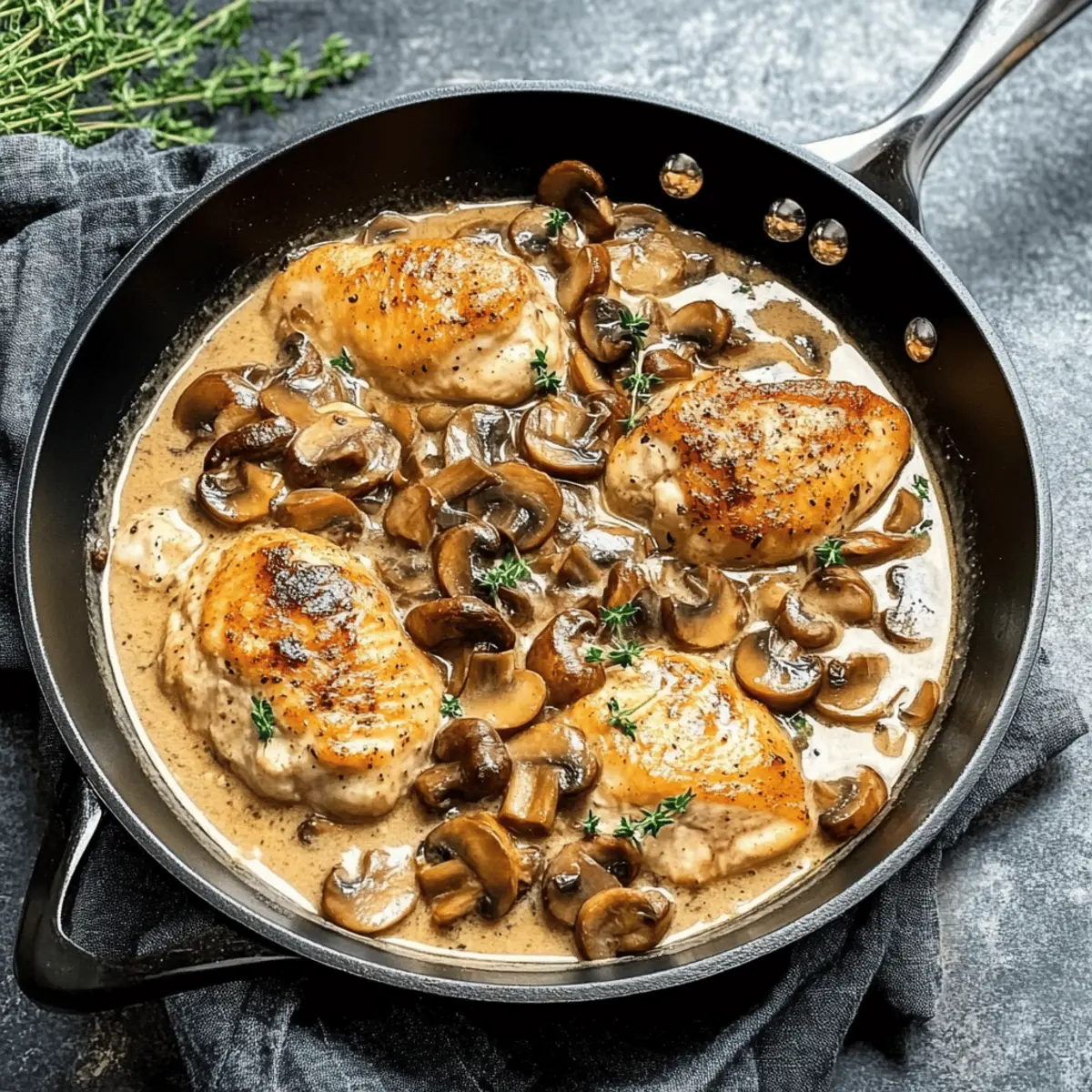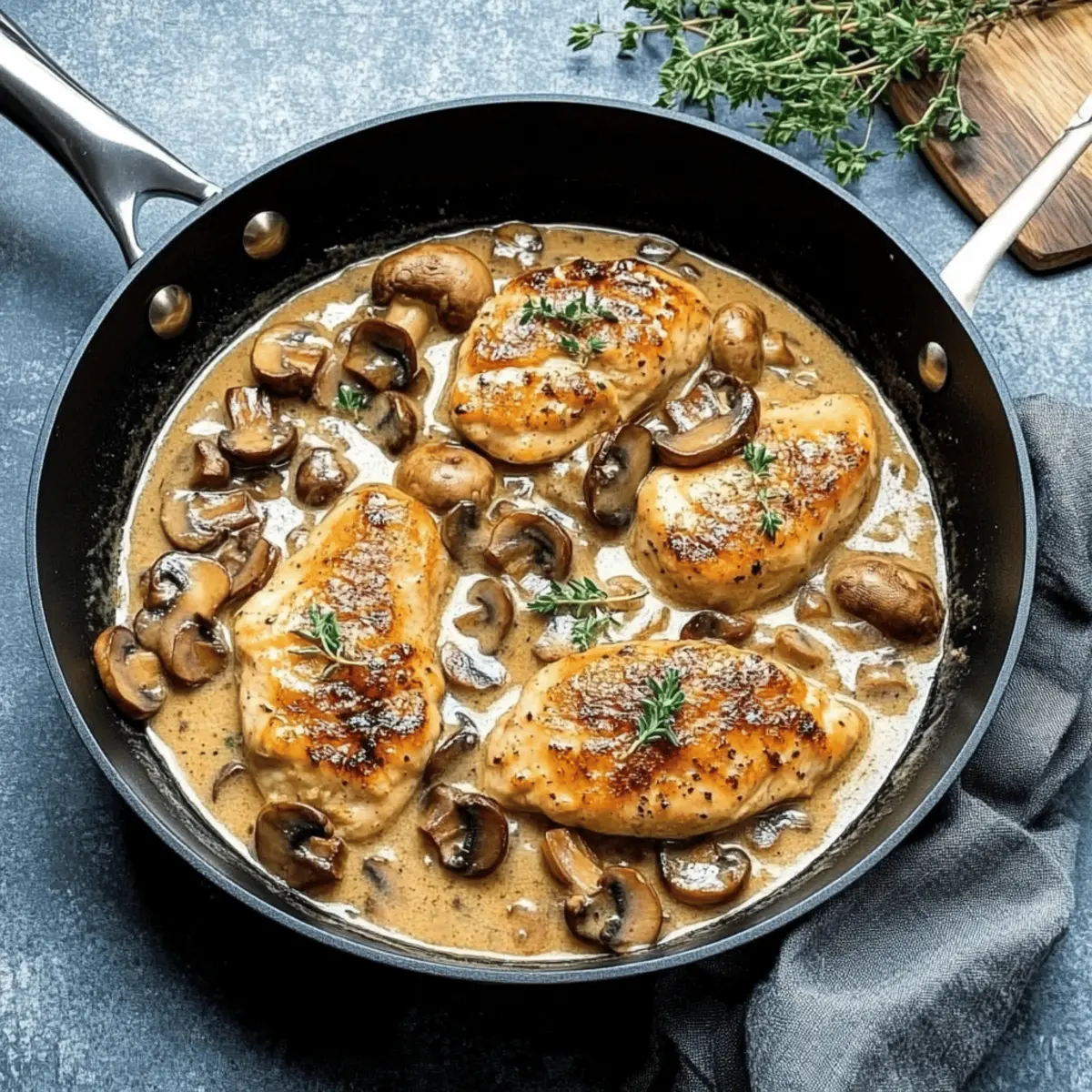 Turn off the heat and sprinkle fresh thyme over the skillet for a burst of freshness. Serve your Skillet Chicken and Mushroom Wine Sauce over wild rice, buttery mashed potatoes, or flat noodles to soak up the creamy sauce. Enjoy this delightful, quick weeknight dinner!