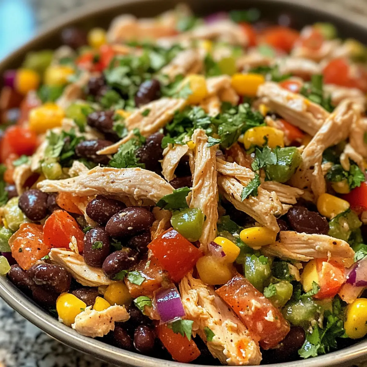 - In a large mixing bowl, combine shredded chicken, black beans, corn, red bell pepper, red onion, and cilantro. Pour the dressing over and stir gently to coat.